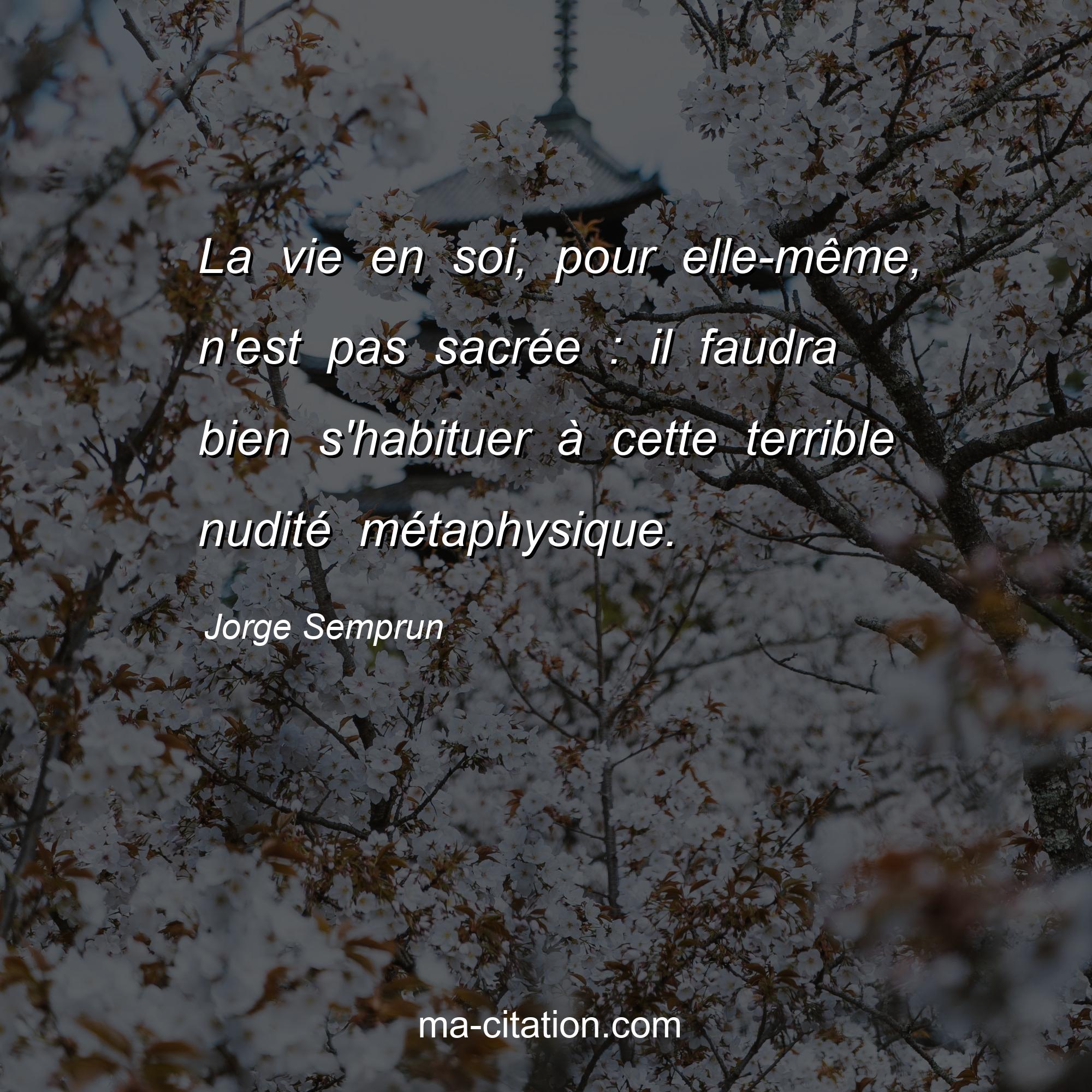 Citation sur la vie de Jorge Semprun :La vie en soi, pour elle-même, n'est pas sacrée : il faudra bien s'habituer à cette terrible nudité métaphysique.