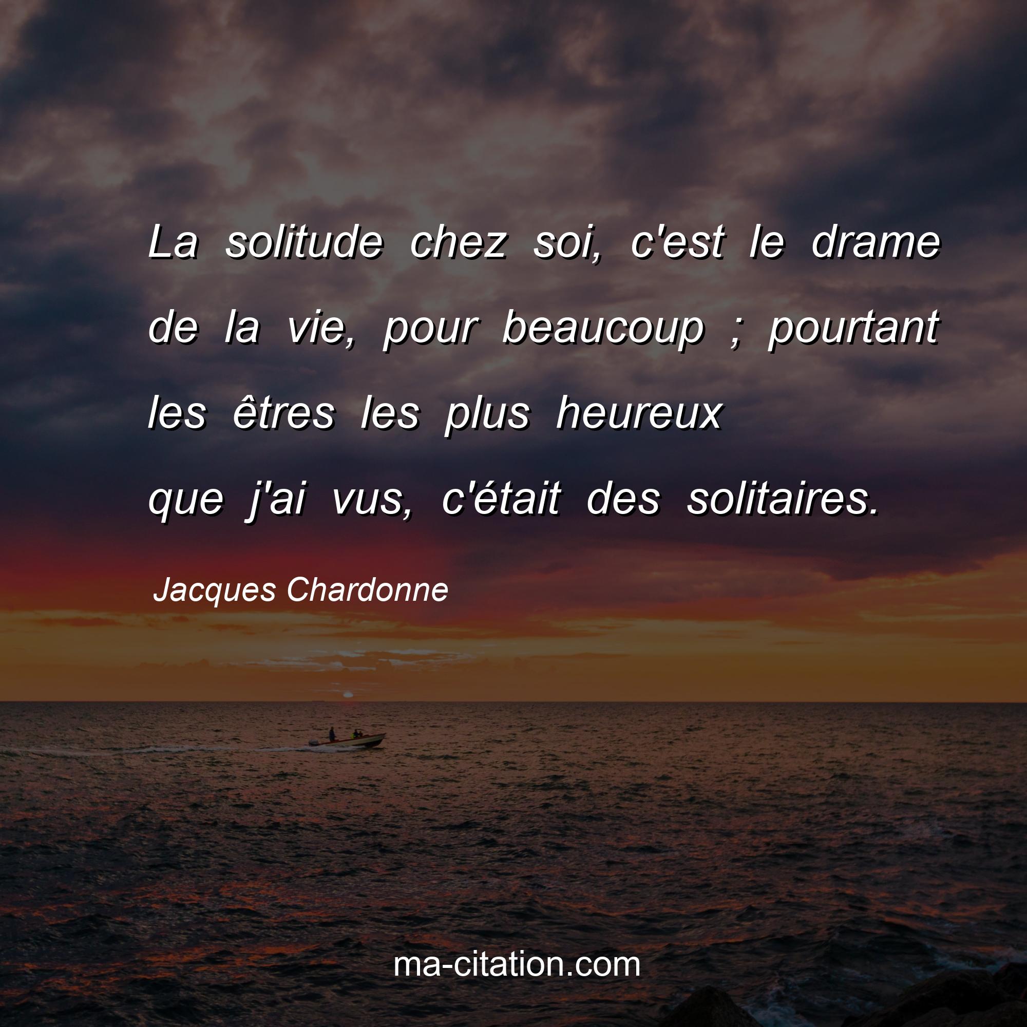 Citation sur la vie de Jacques Chardonne :La solitude chez soi, c'est le drame de la vie, pour beaucoup ; pourtant les êtres les plus heureux que j'ai vus, c'était des solitaires.