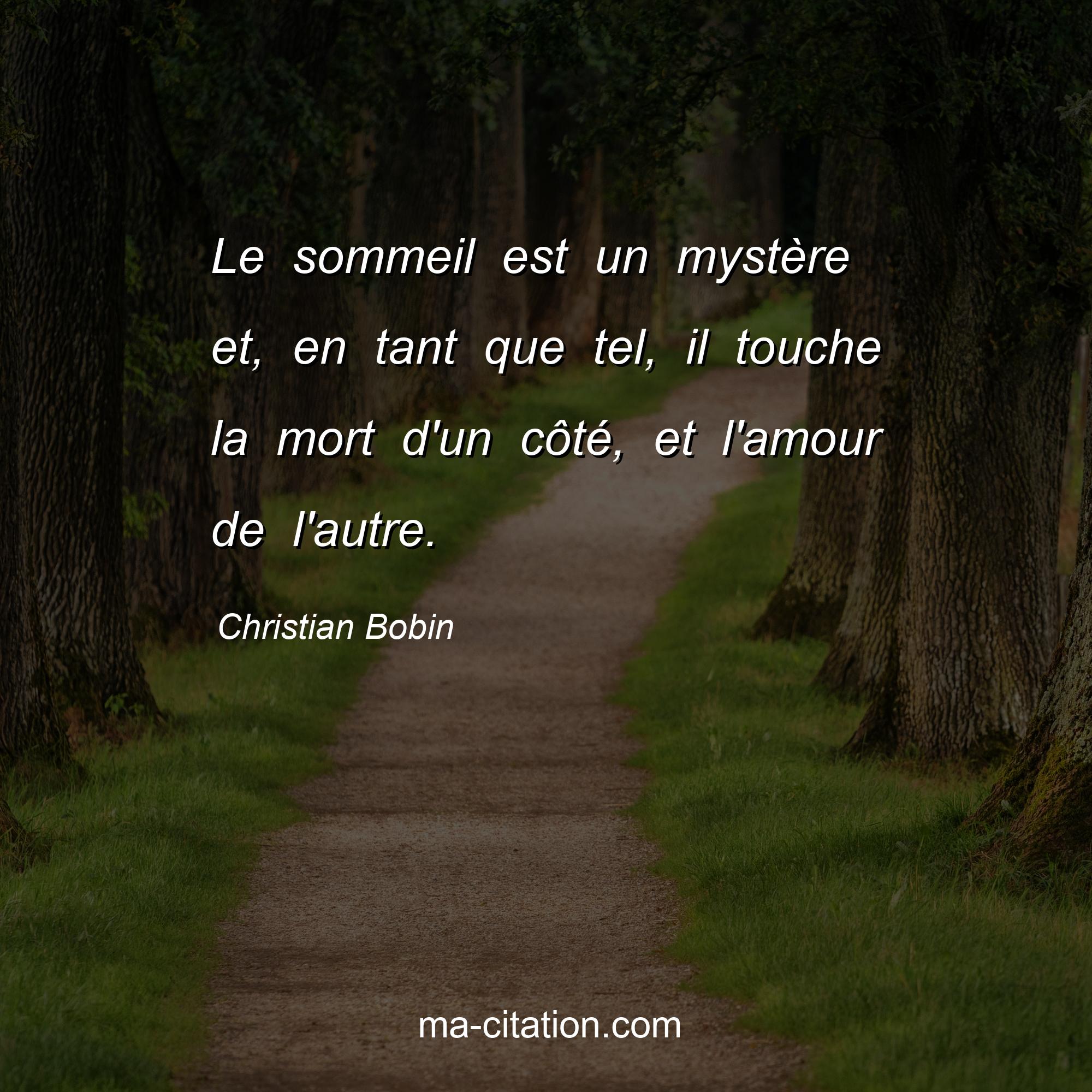 Citation sur la vie de Christian Bobin :Le sommeil est un mystère et, en tant que tel, il touche la mort d'un côté, et l'amour de l'autre.