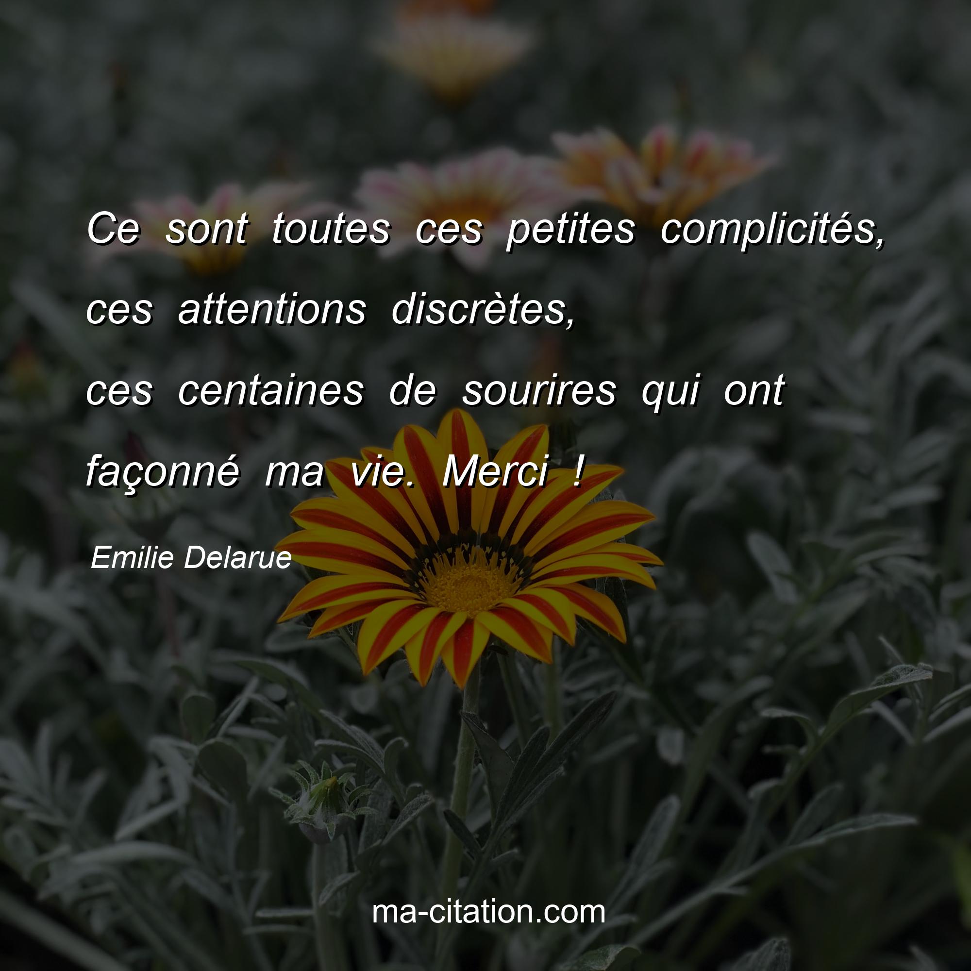 Emilie Delarue est l'auteur de la citation sur la vie "Ce sont toutes ces petites complicités, ces attentions discrètes, ces centaines de sourires qui ont façonné ma vie. Merci !".