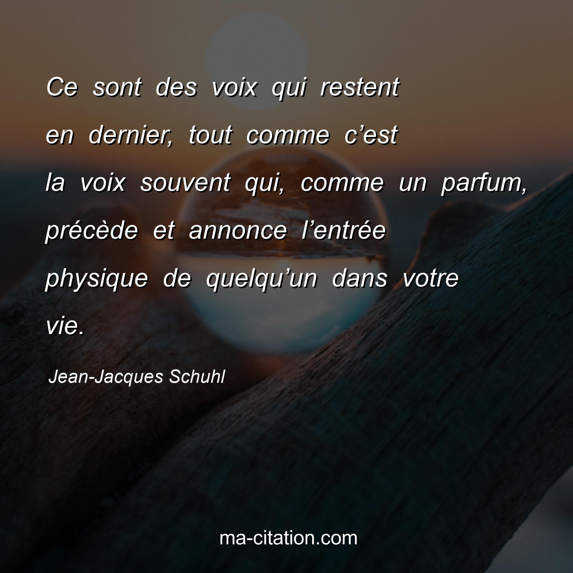 Citation sur la vie de Jean-Jacques Schuhl :Ce sont des voix qui restent en dernier, tout comme c’est la voix souvent qui, comme un parfum, précède et annonce l’entrée physique de quelqu’un dans votre vie.