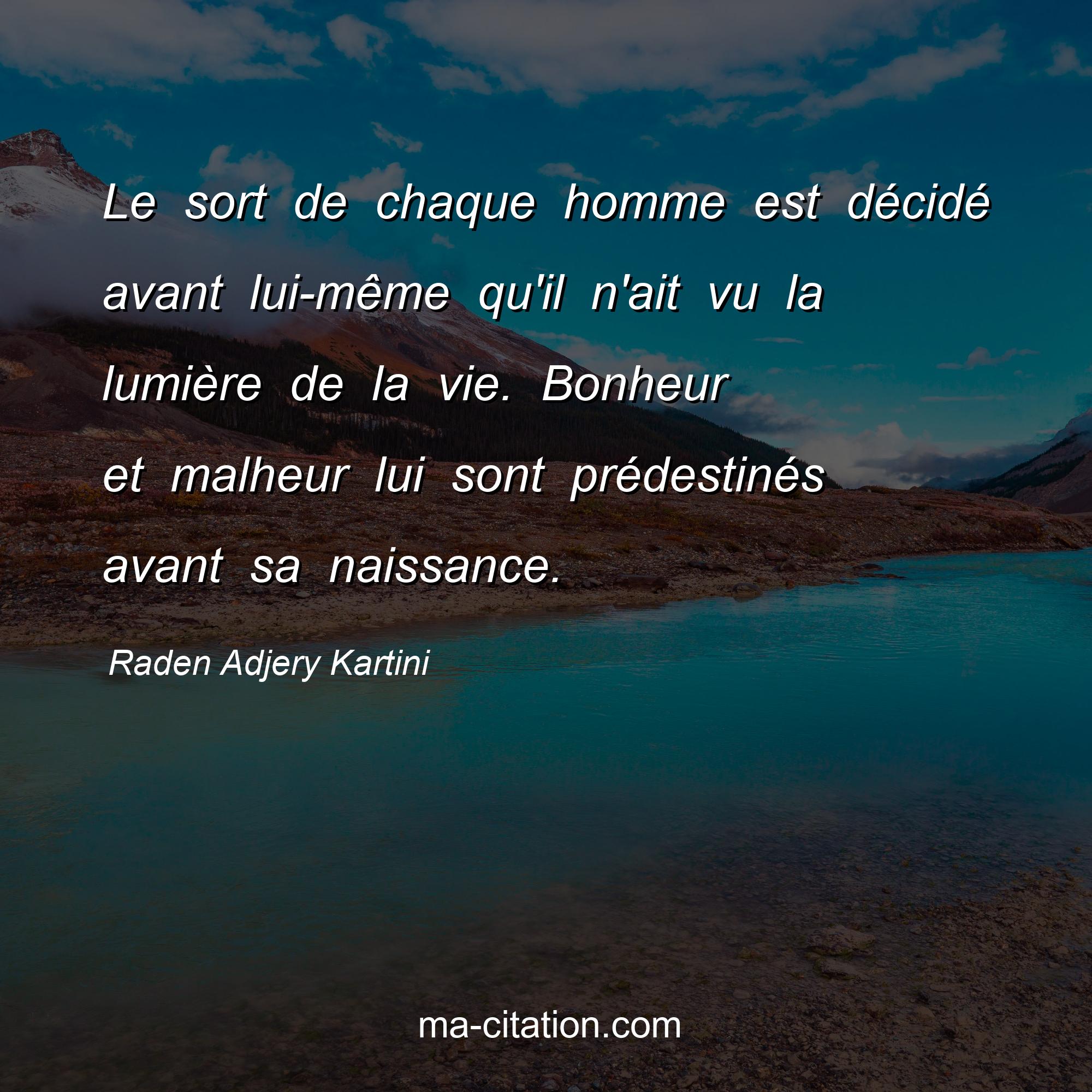 Citation sur la vie de Raden Adjery Kartini :Le sort de chaque homme est décidé avant lui-même qu'il n'ait vu la lumière de la vie. Bonheur et malheur lui sont prédestinés avant sa naissance.