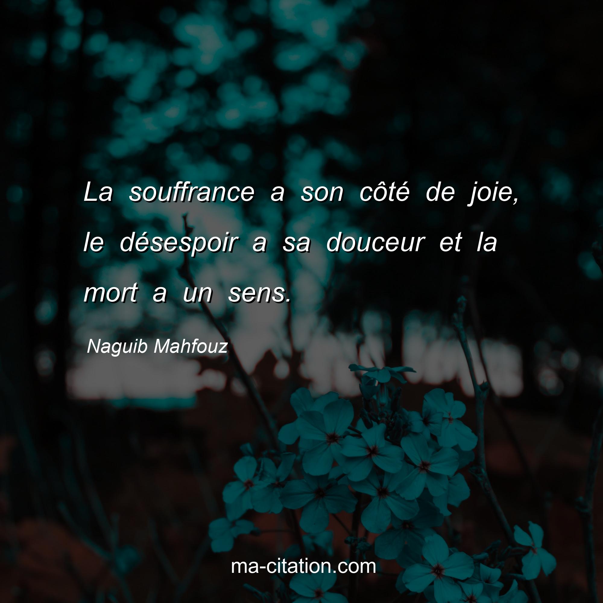 Citation sur la vie de Naguib Mahfouz :La souffrance a son côté de joie, le désespoir a sa douceur et la mort a un sens.