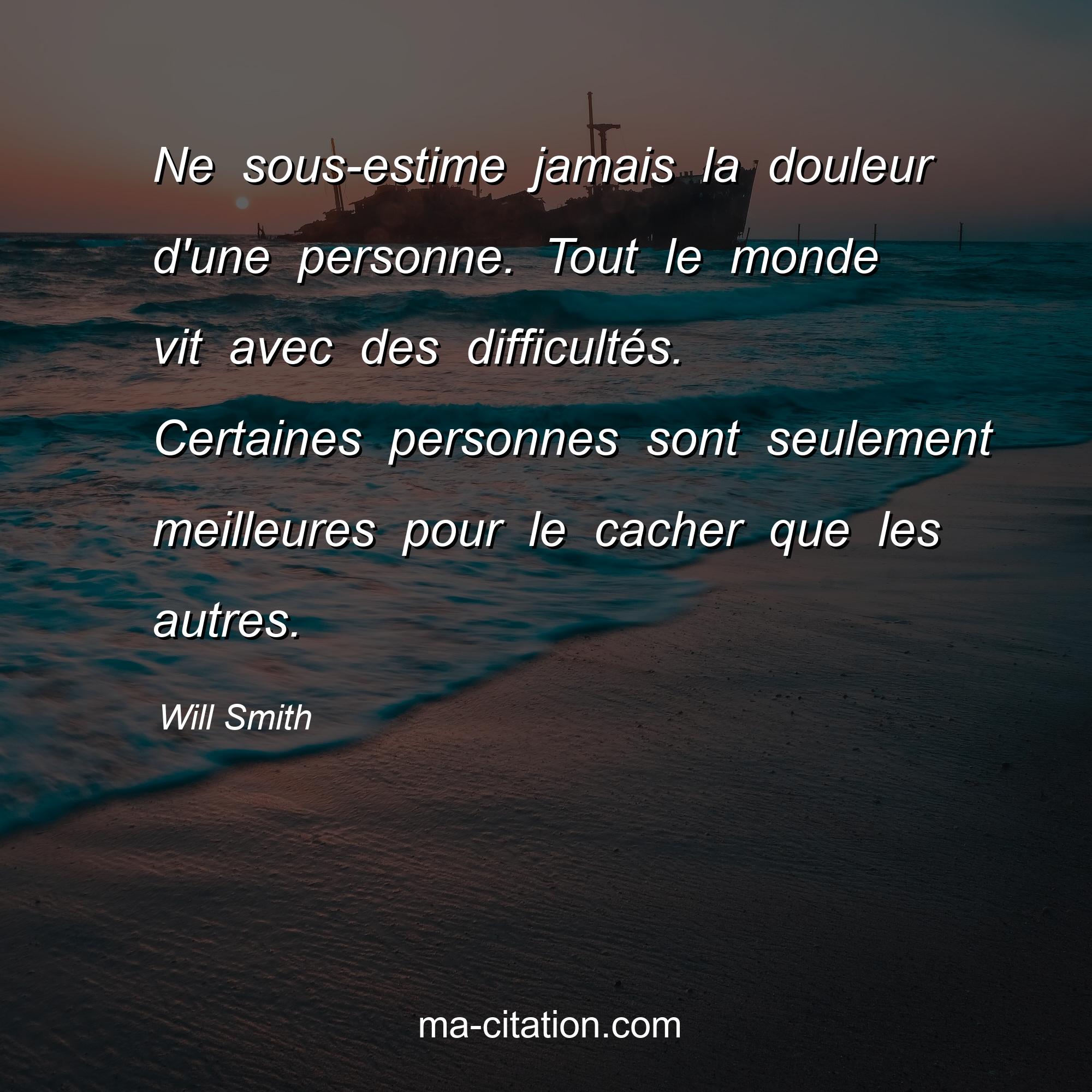 Citation sur la vie de Will Smith :Ne sous-estime jamais la douleur d'une personne. Tout le monde vit avec des difficultés. Certaines personnes sont seulement meilleures pour le cacher que les autres.