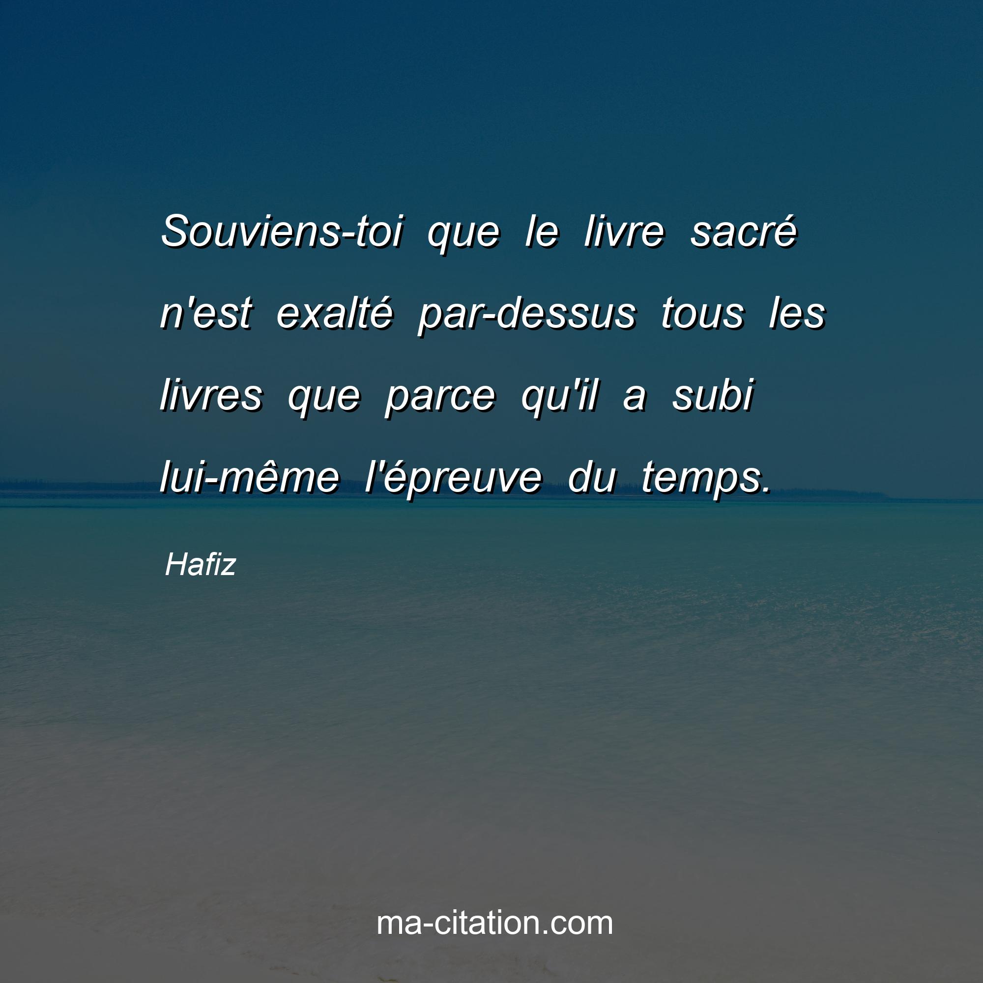 Citation sur la vie de Hafiz :Souviens-toi que le livre sacré n'est exalté par-dessus tous les livres que parce qu'il a subi lui-même l'épreuve du temps.