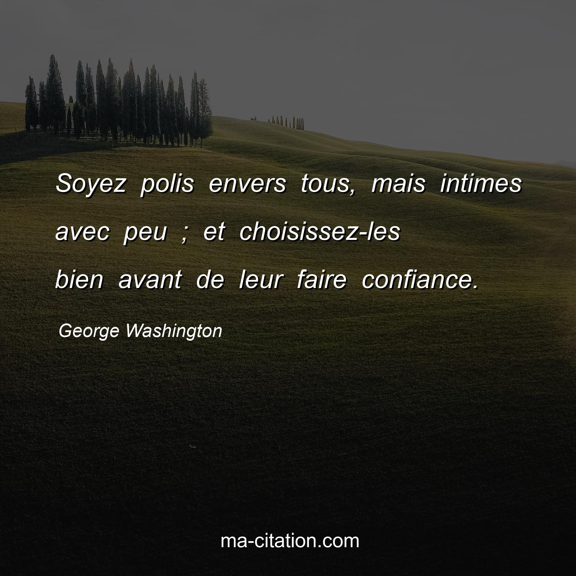 Citation sur la vie de George Washington :Soyez polis envers tous, mais intimes avec peu ; et choisissez-les bien avant de leur faire confiance.