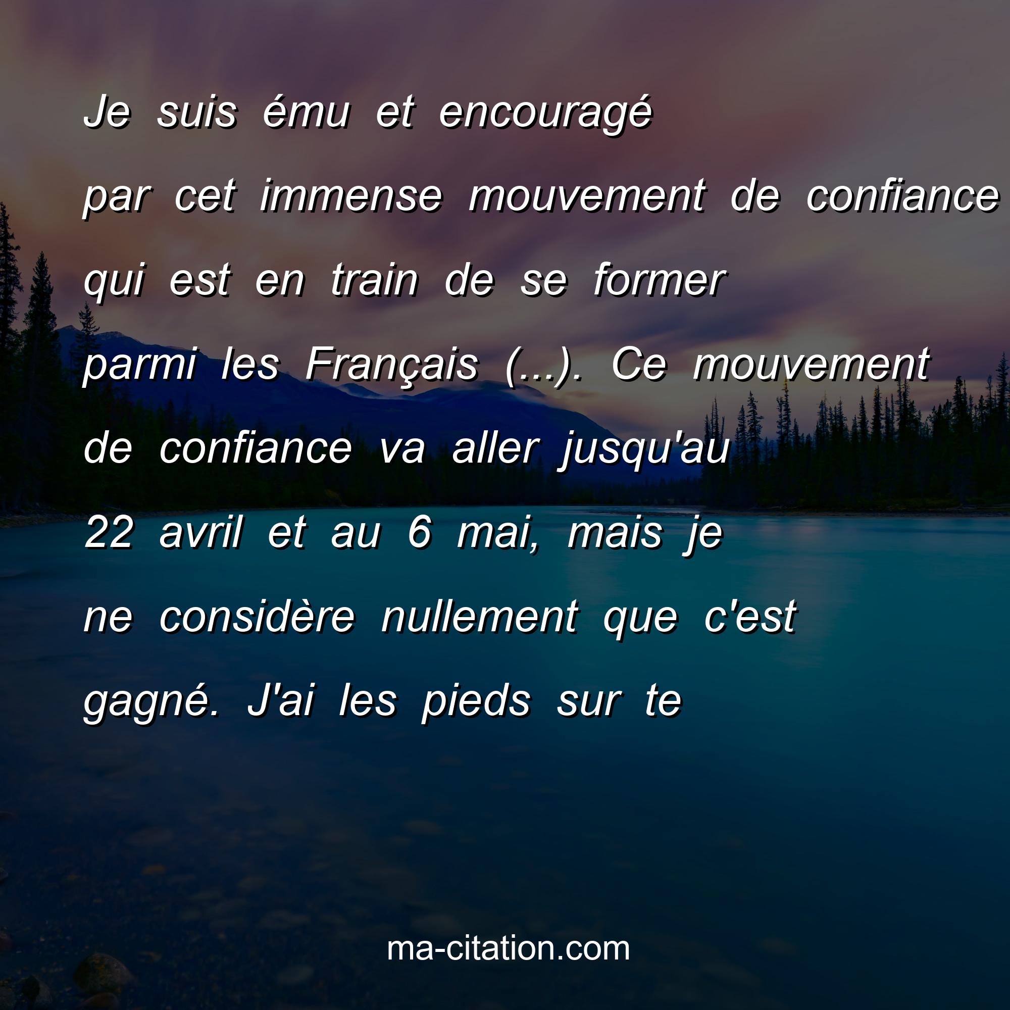 Je suis ému et encouragé par cet immense mouvement de confiance qui est en train de se former parmi les Français (...). Ce mouvement de confiance va aller jusqu'au 22 avril et au 6 mai, mais je ne considère nullement que c'est gagné. J'ai les pieds sur te