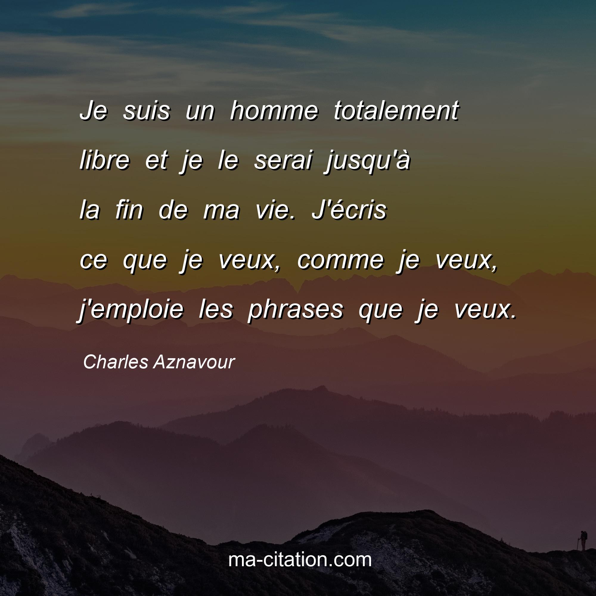 Citation sur la vie de Charles Aznavour :Je suis un homme totalement libre et je le serai jusqu'à la fin de ma vie. J'écris ce que je veux, comme je veux, j'emploie les phrases que je veux.