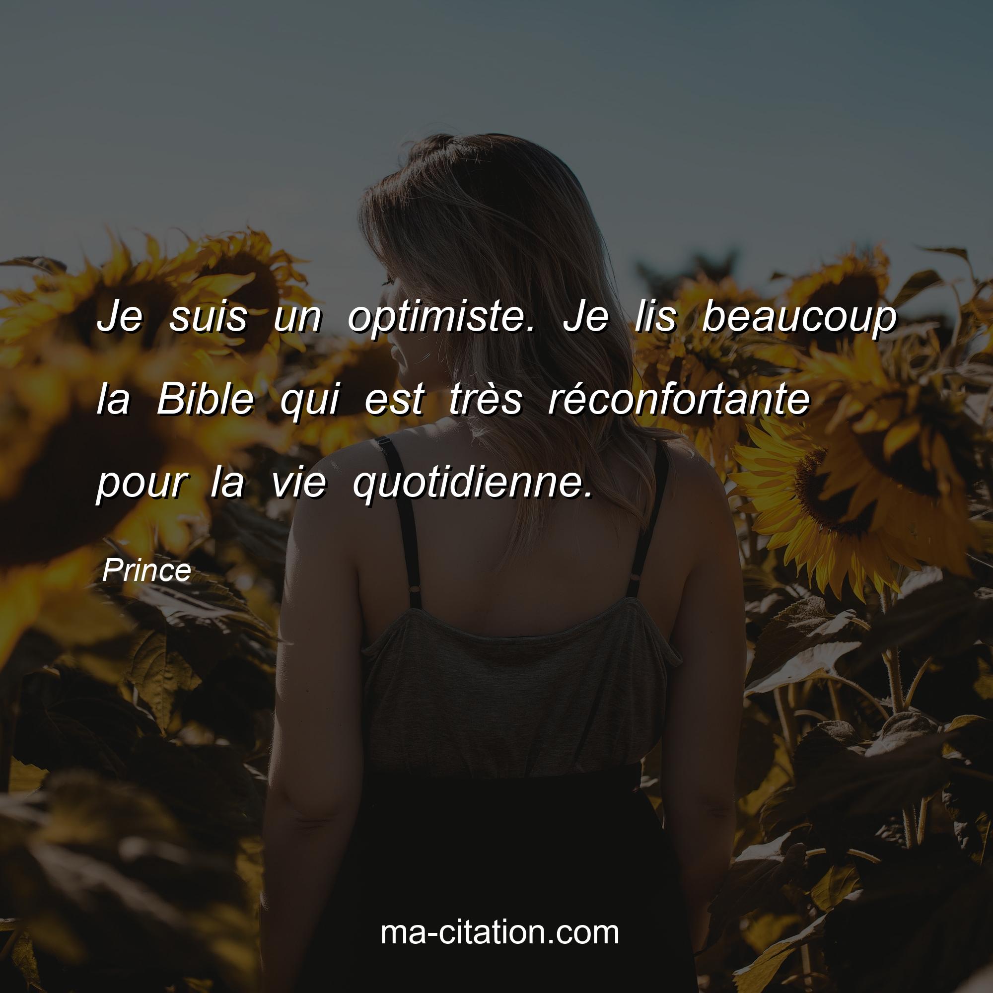 Citation sur la vie de Prince :Je suis un optimiste. Je lis beaucoup la Bible qui est très réconfortante pour la vie quotidienne.