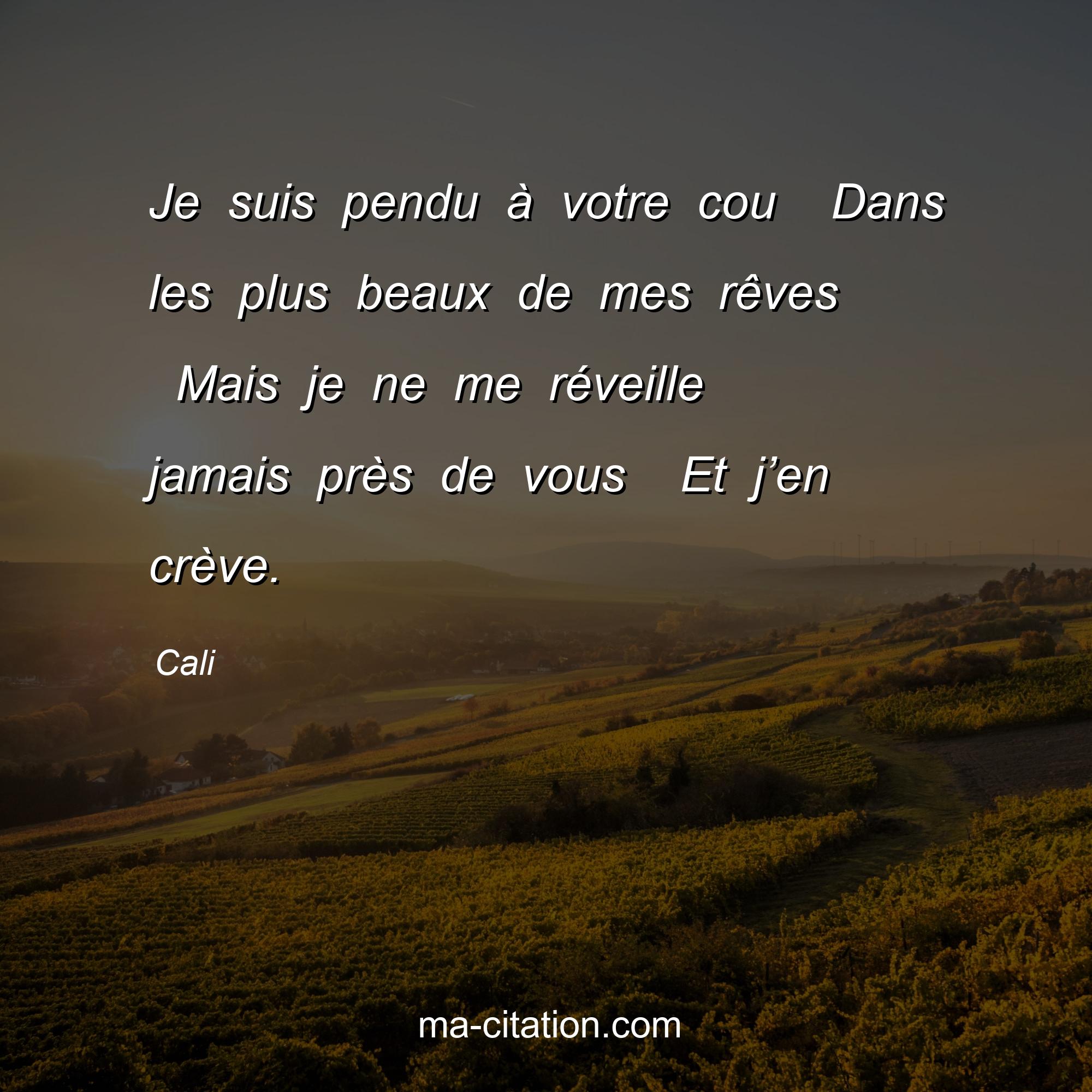 Citation sur la vie de Cali :Je suis pendu à votre cou Dans les plus beaux de mes rêves Mais je ne me réveille jamais près de vous Et j’en crève.