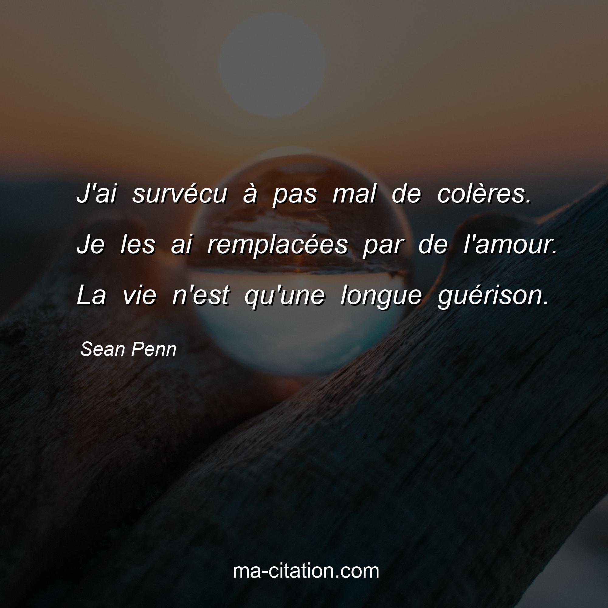 Citation sur la vie de Sean Penn :J'ai survécu à pas mal de colères. Je les ai remplacées par de l'amour. La vie n'est qu'une longue guérison.