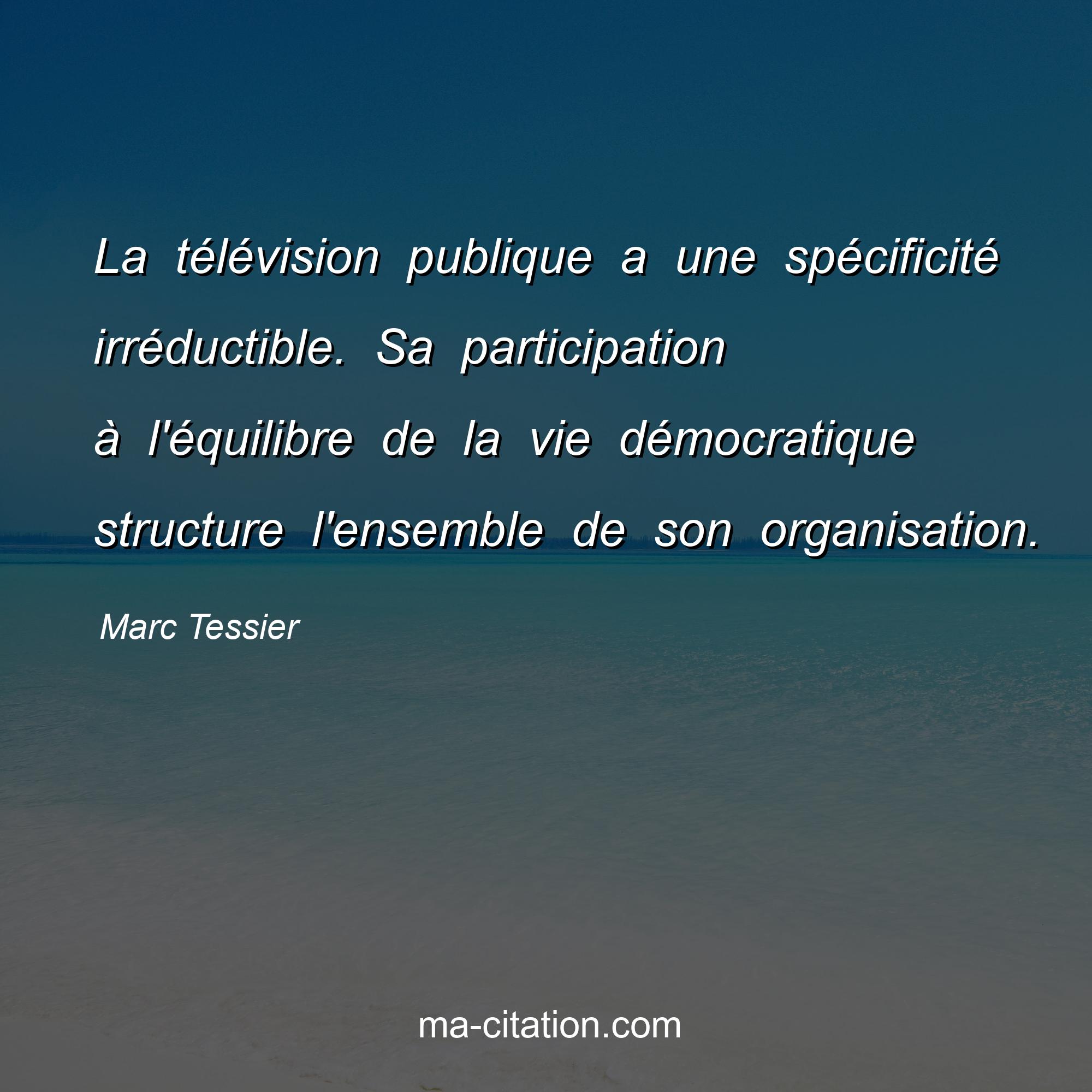 Citation sur la vie de Marc Tessier :La télévision publique a une spécificité irréductible. Sa participation à l'équilibre de la vie démocratique structure l'ensemble de son organisation.