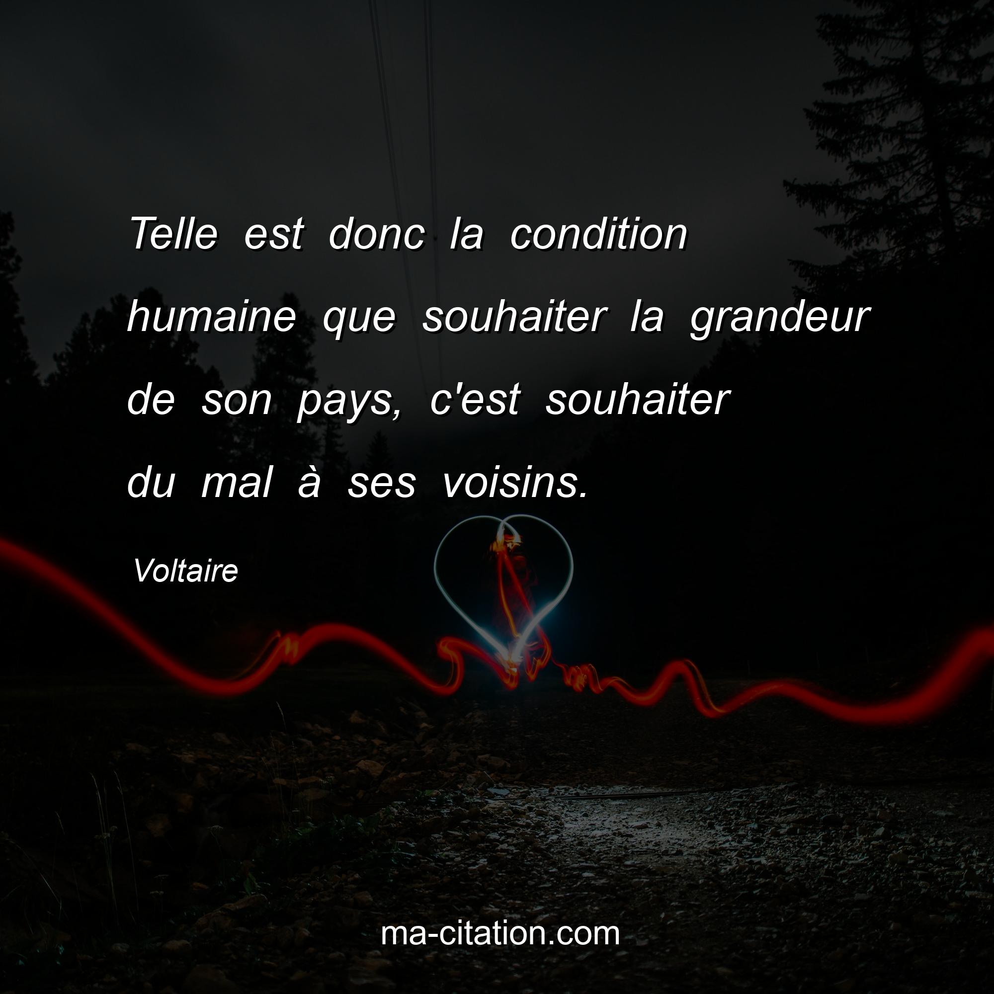 Citation sur la vie de Voltaire :Telle est donc la condition humaine que souhaiter la grandeur de son pays, c'est souhaiter du mal à ses voisins.