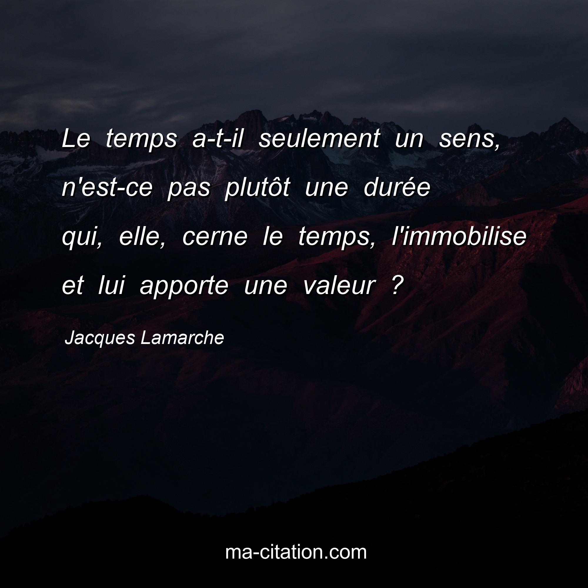 Citation sur la vie de Jacques Lamarche :Le temps a-t-il seulement un sens, n'est-ce pas plutôt une durée qui, elle, cerne le temps, l'immobilise et lui apporte une valeur ?