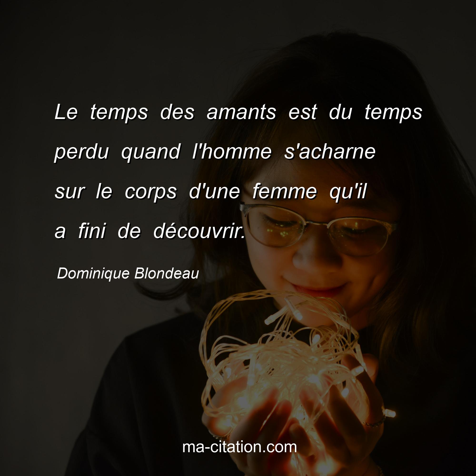 Citation sur la vie de Dominique Blondeau :Le temps des amants est du temps perdu quand l'homme s'acharne sur le corps d'une femme qu'il a fini de découvrir.