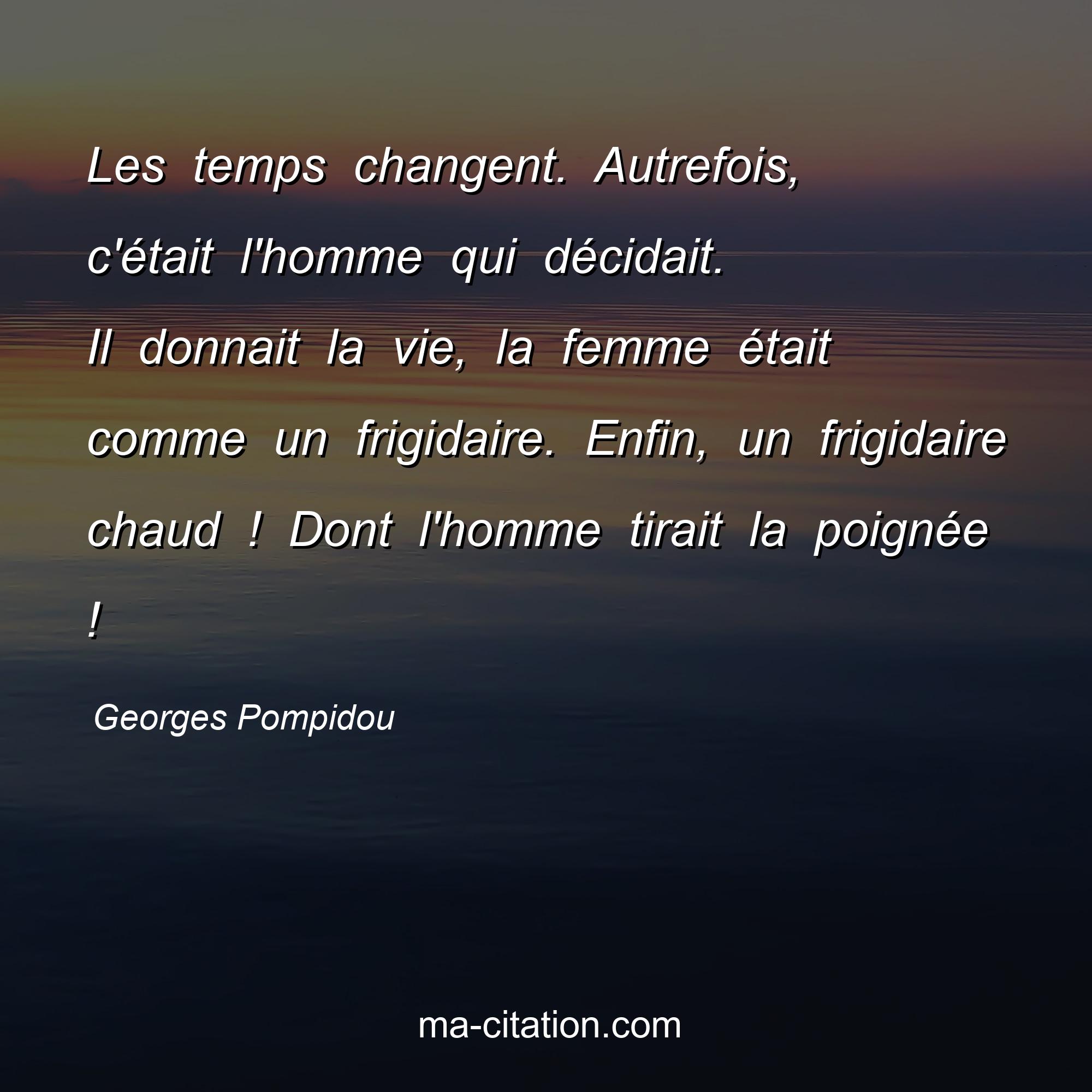 Citation sur la vie de Georges Pompidou :Les temps changent. Autrefois, c'était l'homme qui décidait. Il donnait la vie, la femme était comme un frigidaire. Enfin, un frigidaire chaud ! Dont l'homme tirait la poignée !