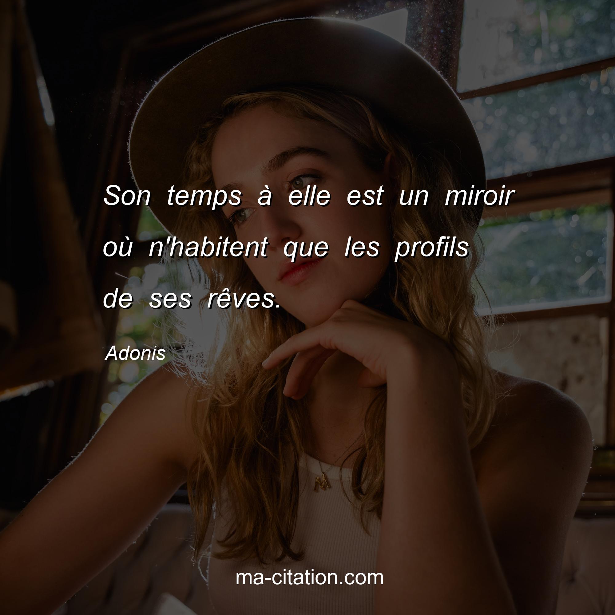 Adonis est l'auteur de la citation sur la vie "Son temps à elle est un miroir où n'habitent que les profils de ses rêves.".