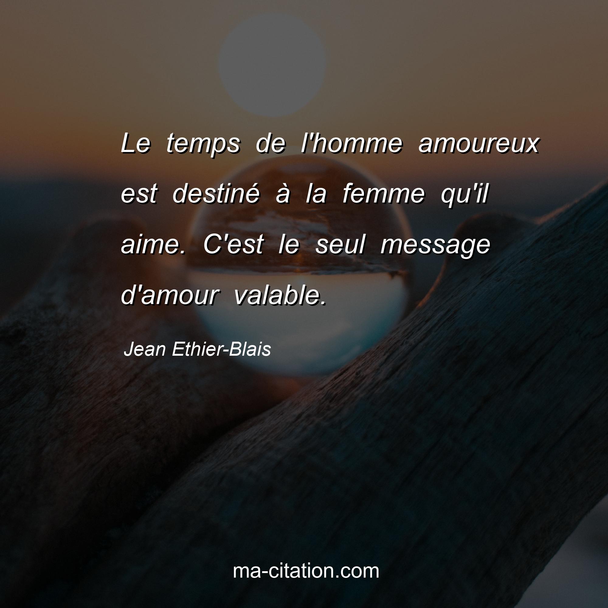 Citation sur la vie de Jean Ethier-Blais :Le temps de l'homme amoureux est destiné à la femme qu'il aime. C'est le seul message d'amour valable.