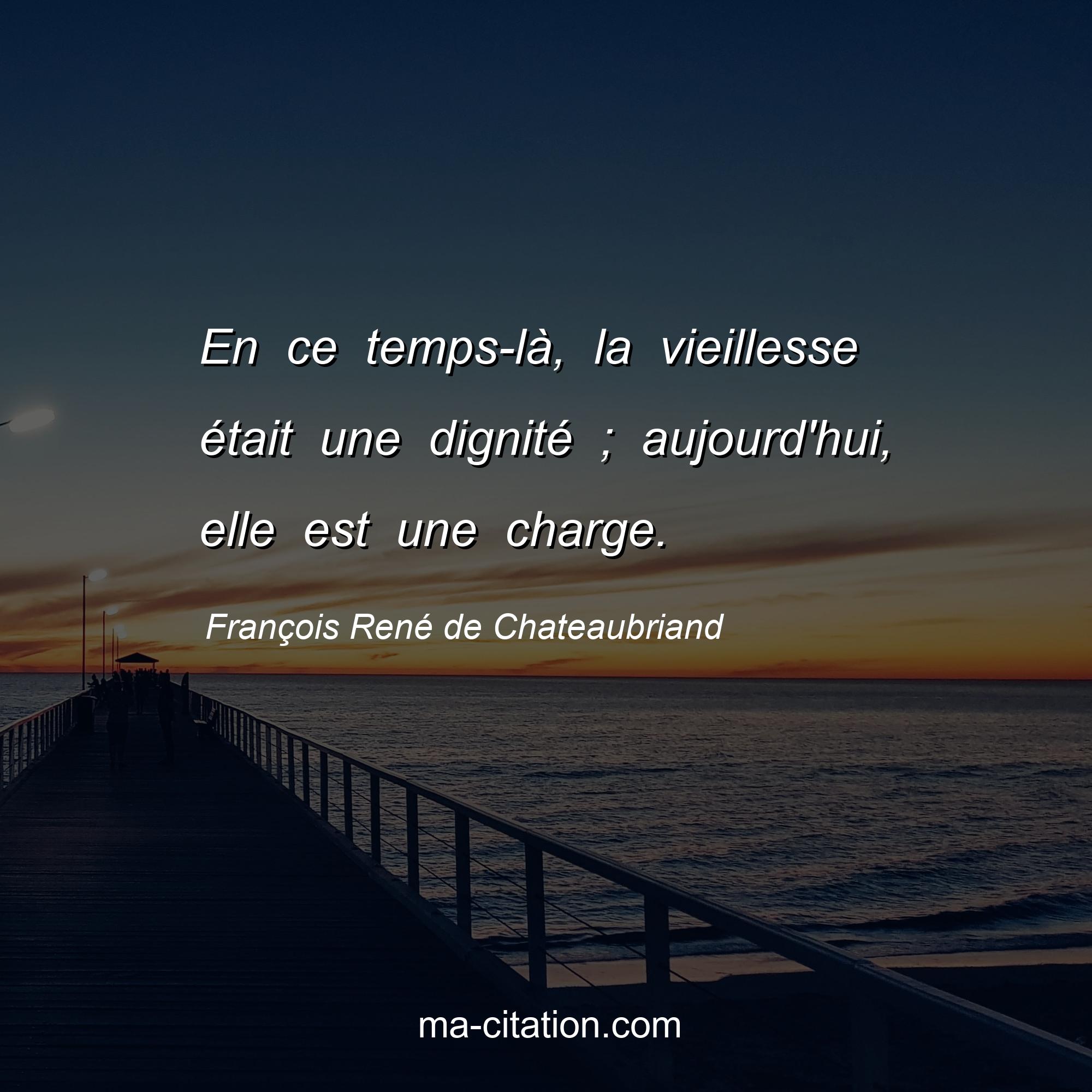 Citation sur la vie de François René de Chateaubriand :En ce temps-là , la vieillesse était une dignité ; aujourd'hui, elle est une charge.