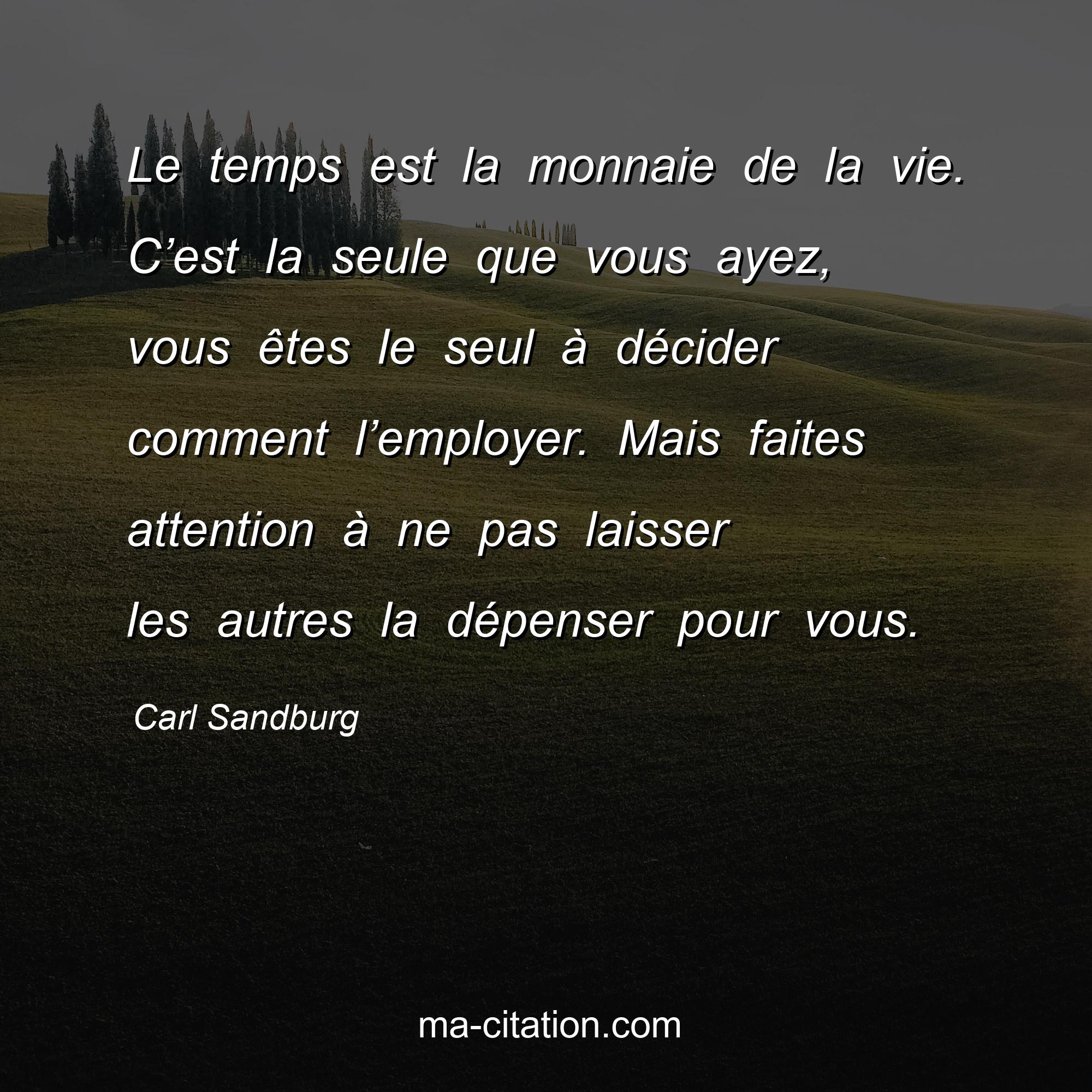 Citation sur la vie de Carl Sandburg :Le temps est la monnaie de la vie. C’est la seule que vous ayez, vous êtes le seul à décider comment l’employer. Mais faites attention à ne pas laisser les autres la dépenser pour vous.