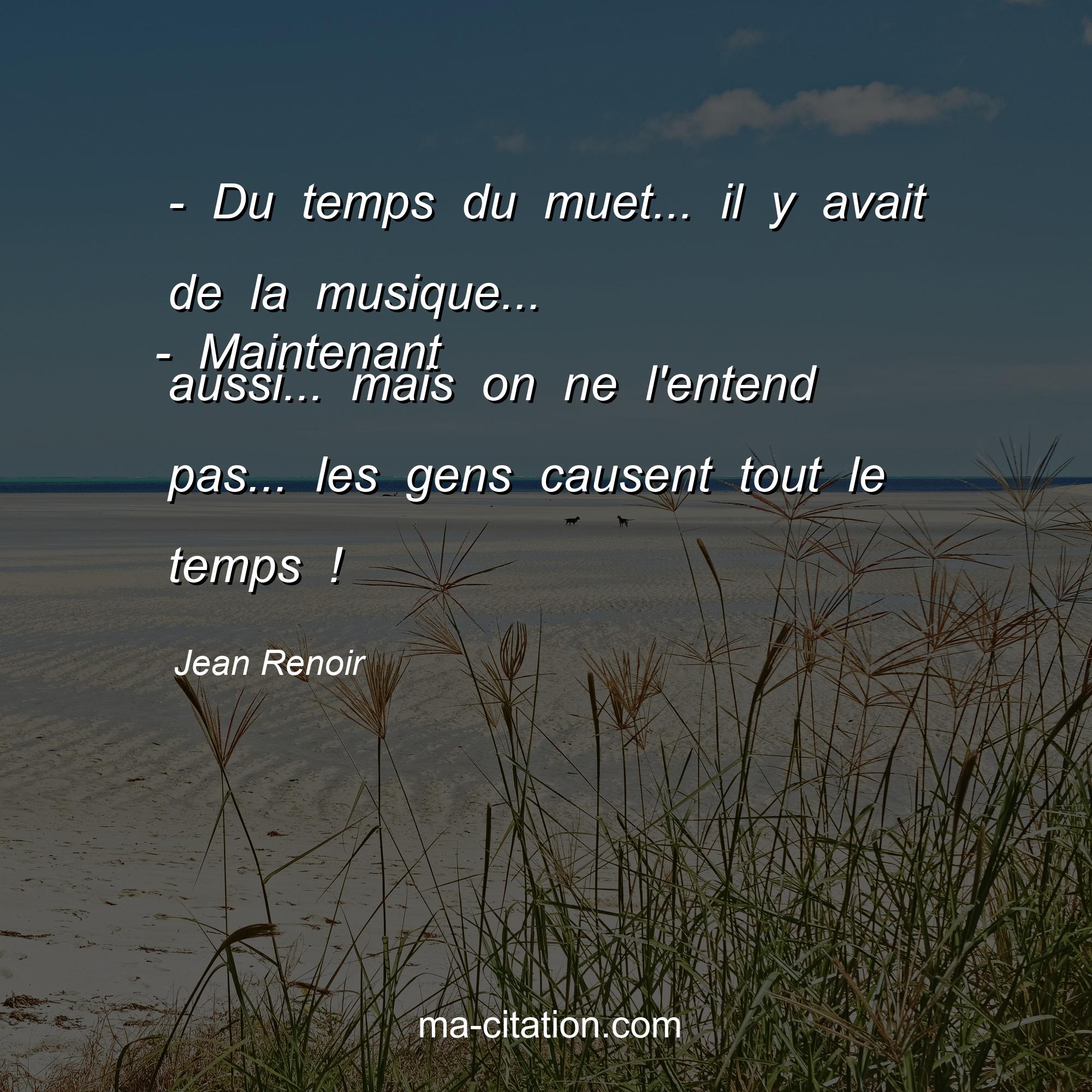 Citation sur la vie de Jean Renoir :- Du temps du muet... il y avait de la musique... - Maintenant aussi... mais on ne l'entend pas... les gens causent tout le temps !