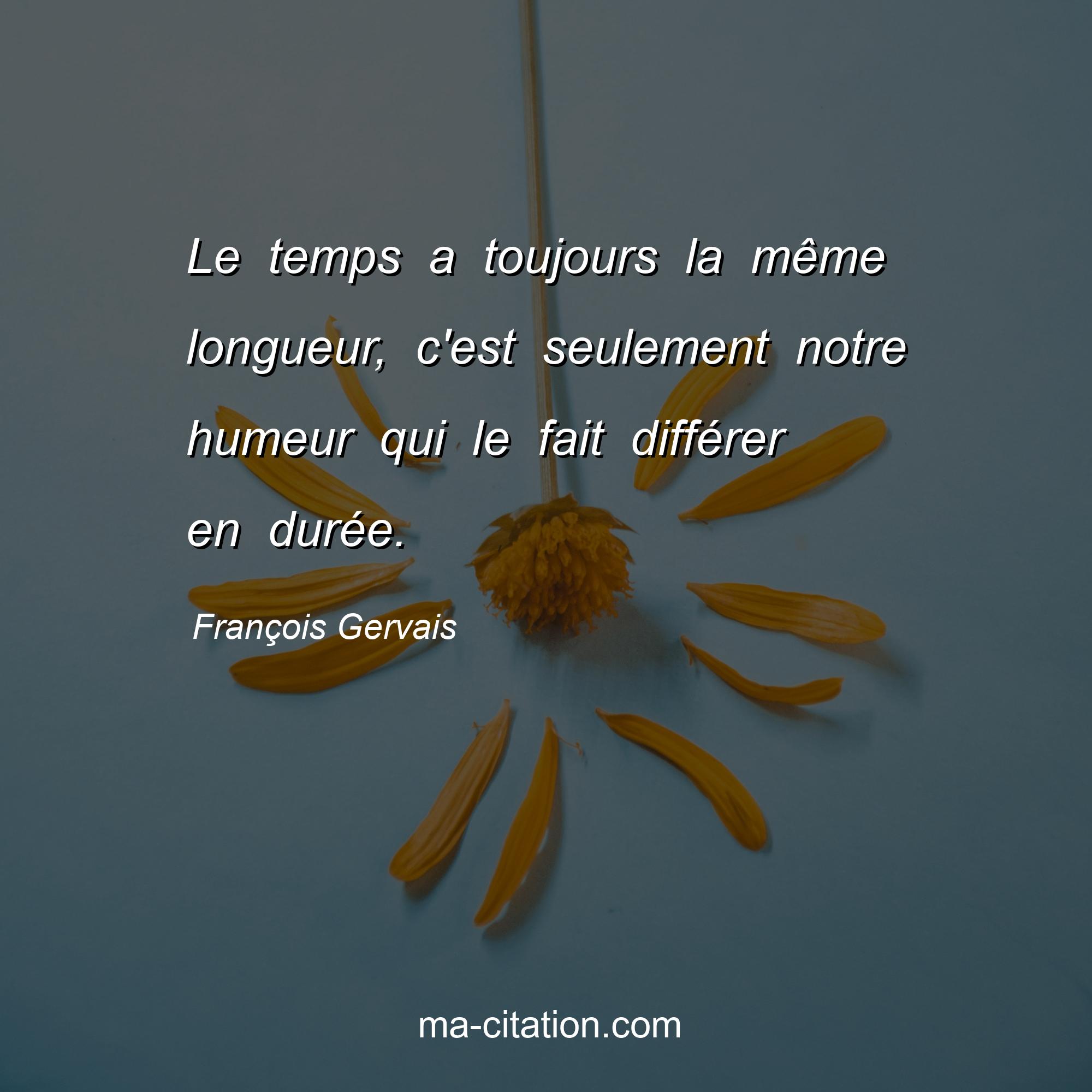 François Gervais est l'auteur de la citation sur la vie "Le temps a toujours la même longueur, c'est seulement notre humeur qui le fait différer en durée.".
