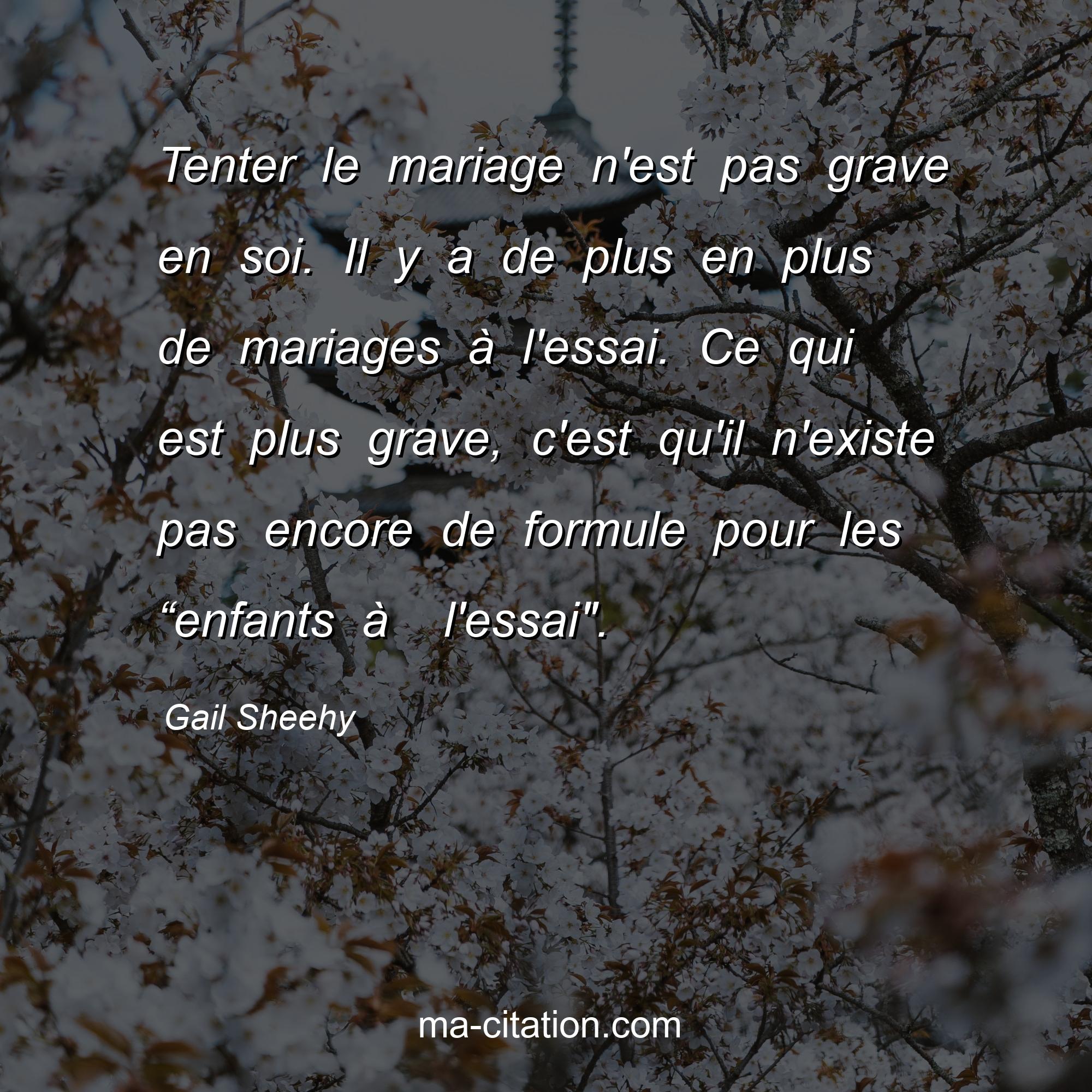 Citation sur la vie de Gail Sheehy :Tenter le mariage n'est pas grave en soi. Il y a de plus en plus de mariages à l'essai. Ce qui est plus grave, c'est qu'il n'existe pas encore de formule pour les “enfants à l'essai".