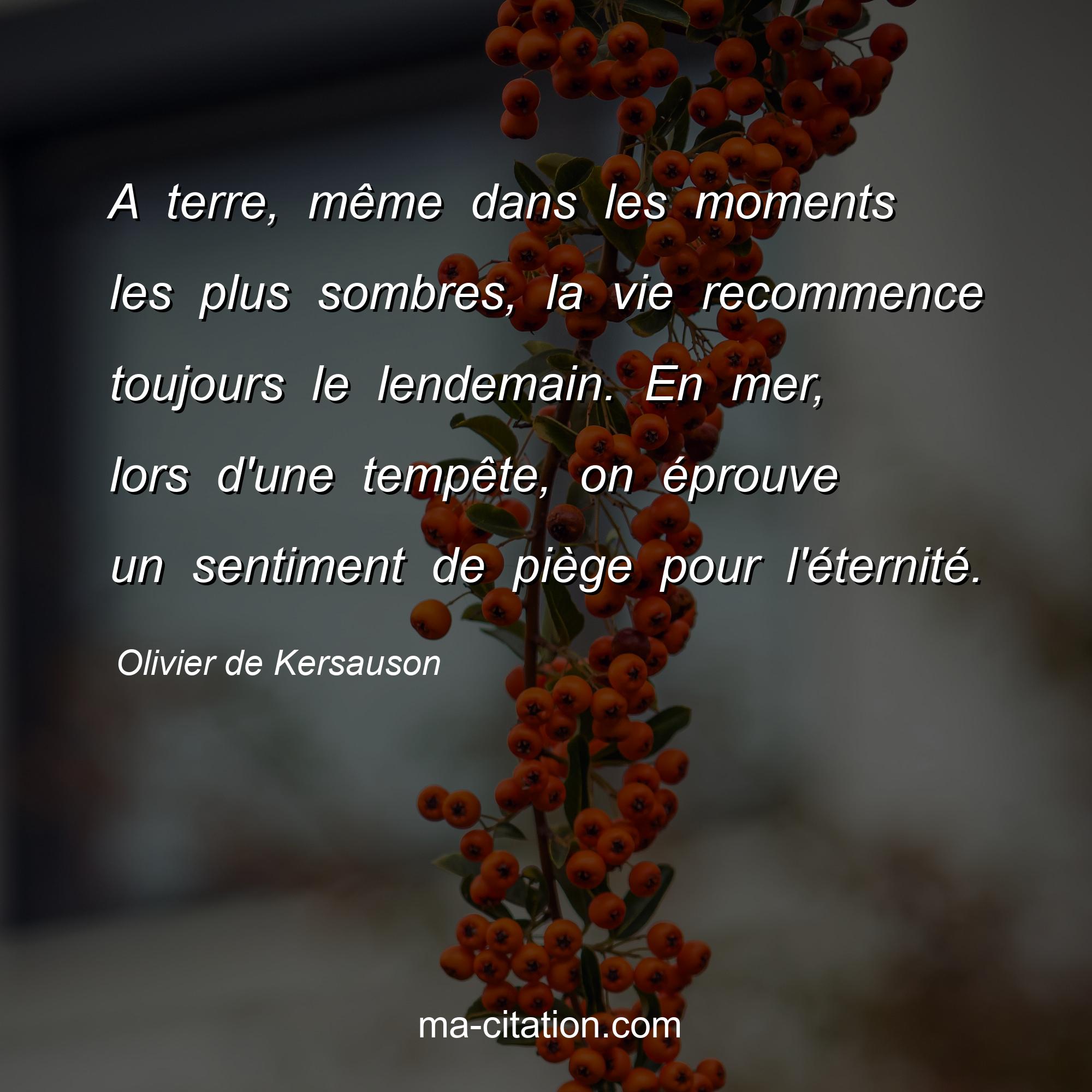 Citation sur la vie d'Olivier de Kersauson :A terre, même dans les moments les plus sombres, la vie recommence toujours le lendemain. En mer, lors d'une tempête, on éprouve un sentiment de piège pour l'éternité.