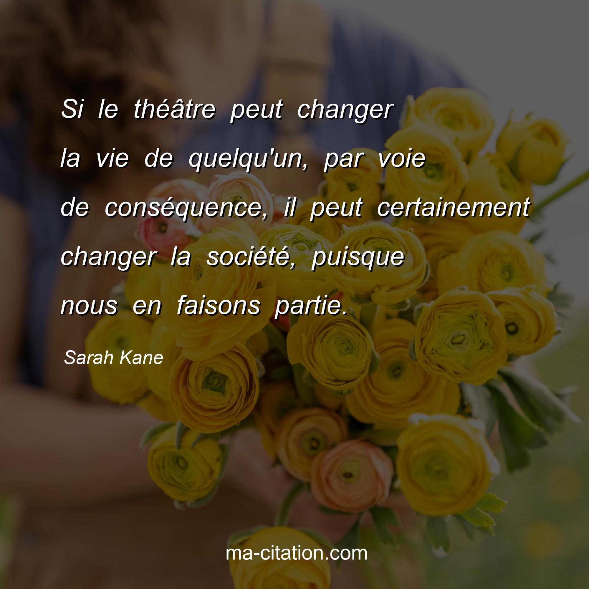 Citation sur la vie de Sarah Kane :Si le théâtre peut changer la vie de quelqu'un, par voie de conséquence, il peut certainement changer la société, puisque nous en faisons partie.