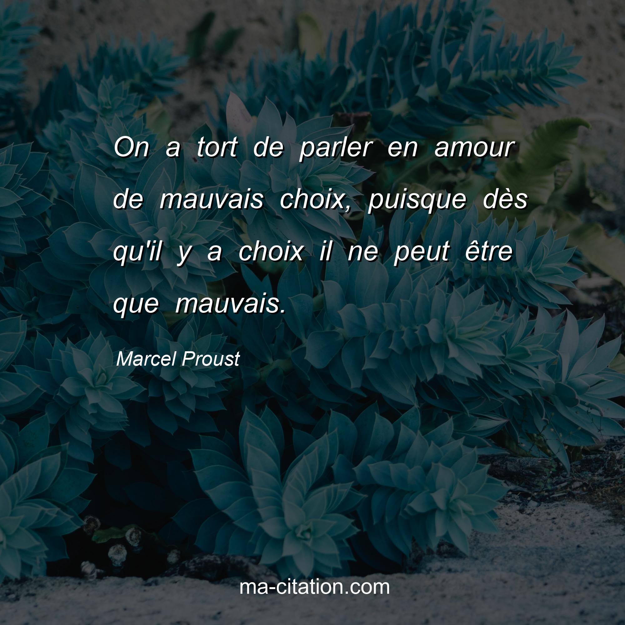 Citation sur la vie de Marcel Proust :On a tort de parler en amour de mauvais choix, puisque dès qu'il y a choix il ne peut être que mauvais.