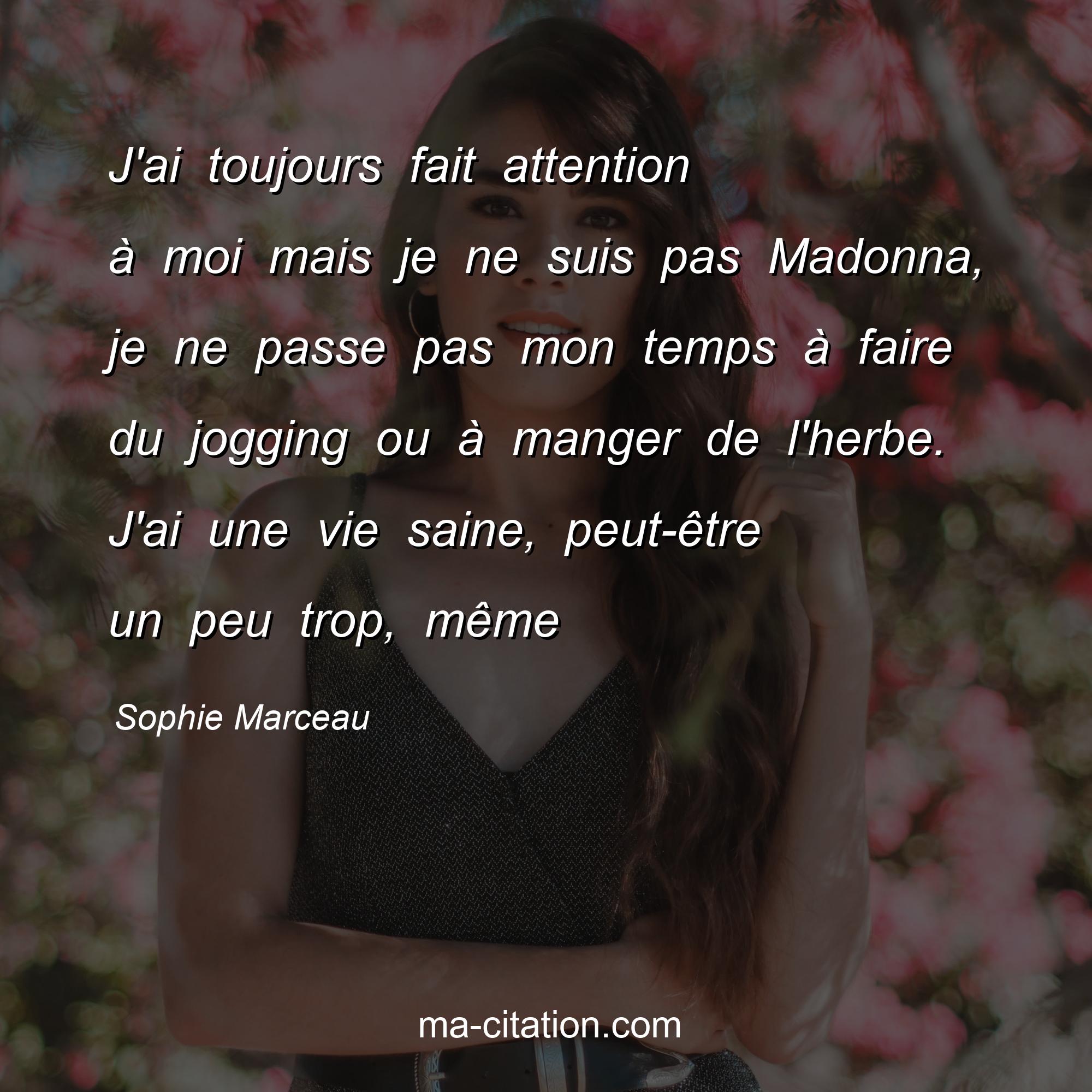 Citation sur la vie de Sophie Marceau :J'ai toujours fait attention à moi mais je ne suis pas Madonna, je ne passe pas mon temps à faire du jogging ou à manger de l'herbe. J'ai une vie saine, peut-être un peu trop, même