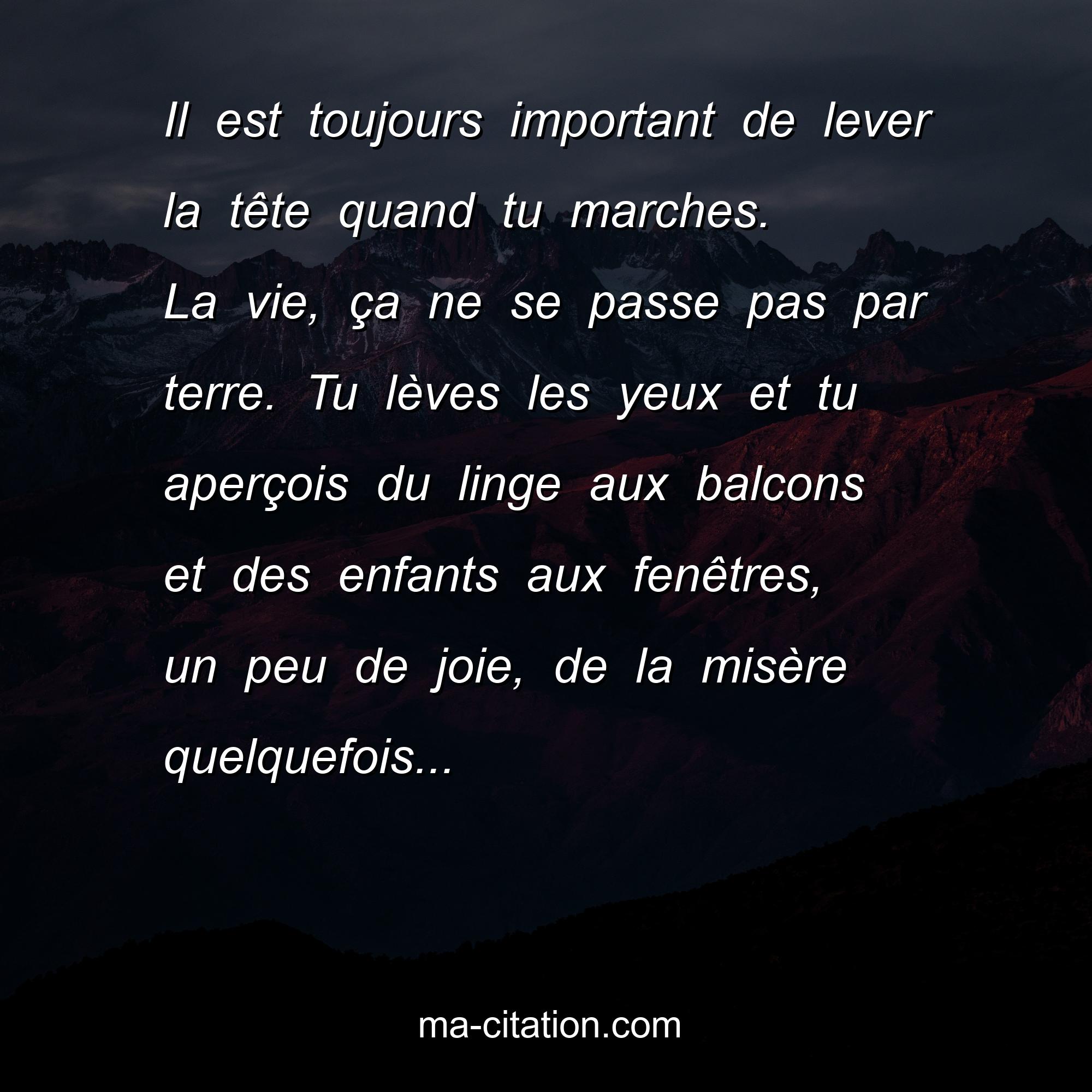 Il est toujours important de lever la tête quand tu marches. La vie, ça ne se passe pas par terre. Tu lèves les yeux et tu aperçois du linge aux balcons et des enfants aux fenêtres, un peu de joie, de la misère quelquefois...