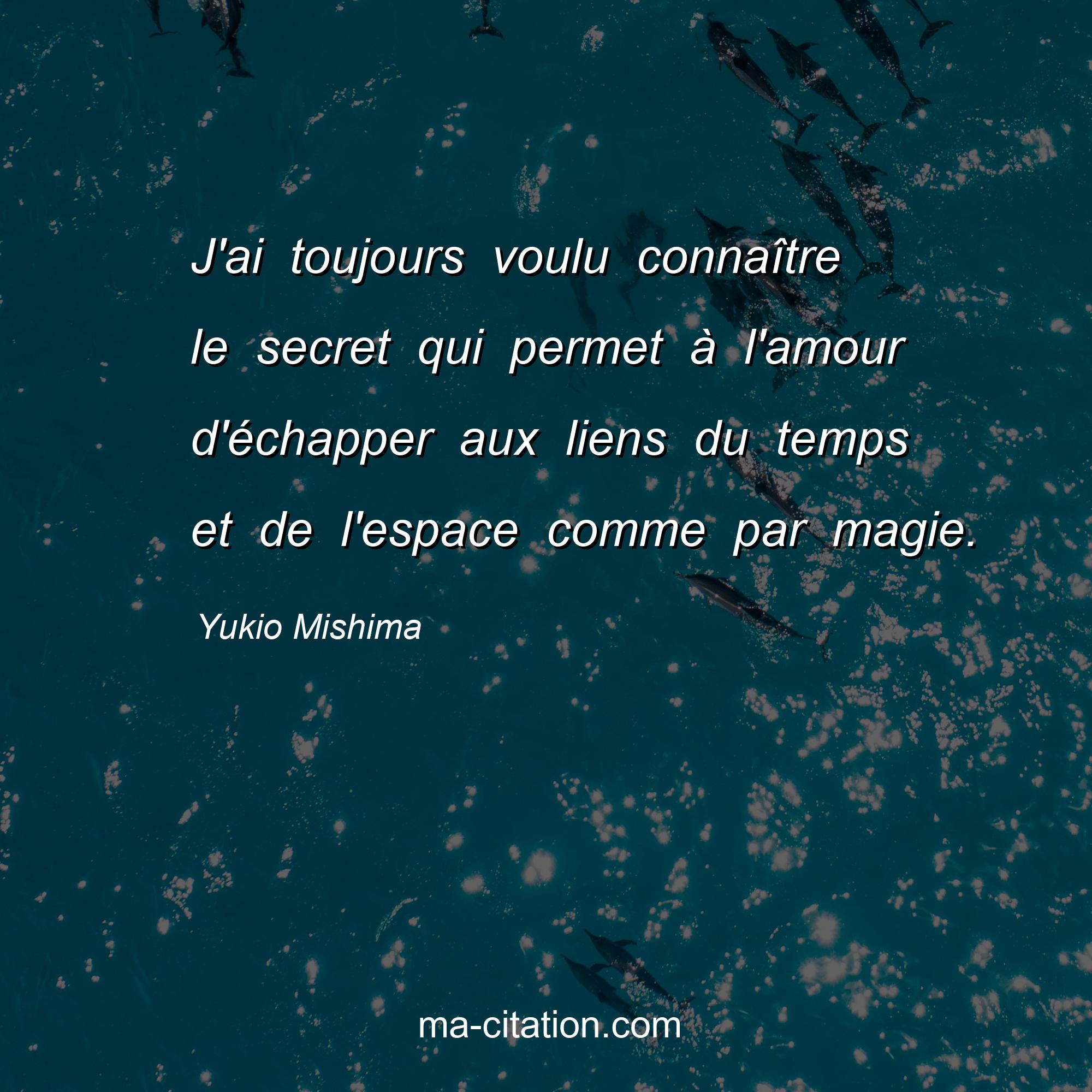 Yukio Mishima est l'auteur de la citation sur la vie "J'ai toujours voulu connaître le secret qui permet à l'amour d'échapper aux liens du temps et de l'espace comme par magie.".