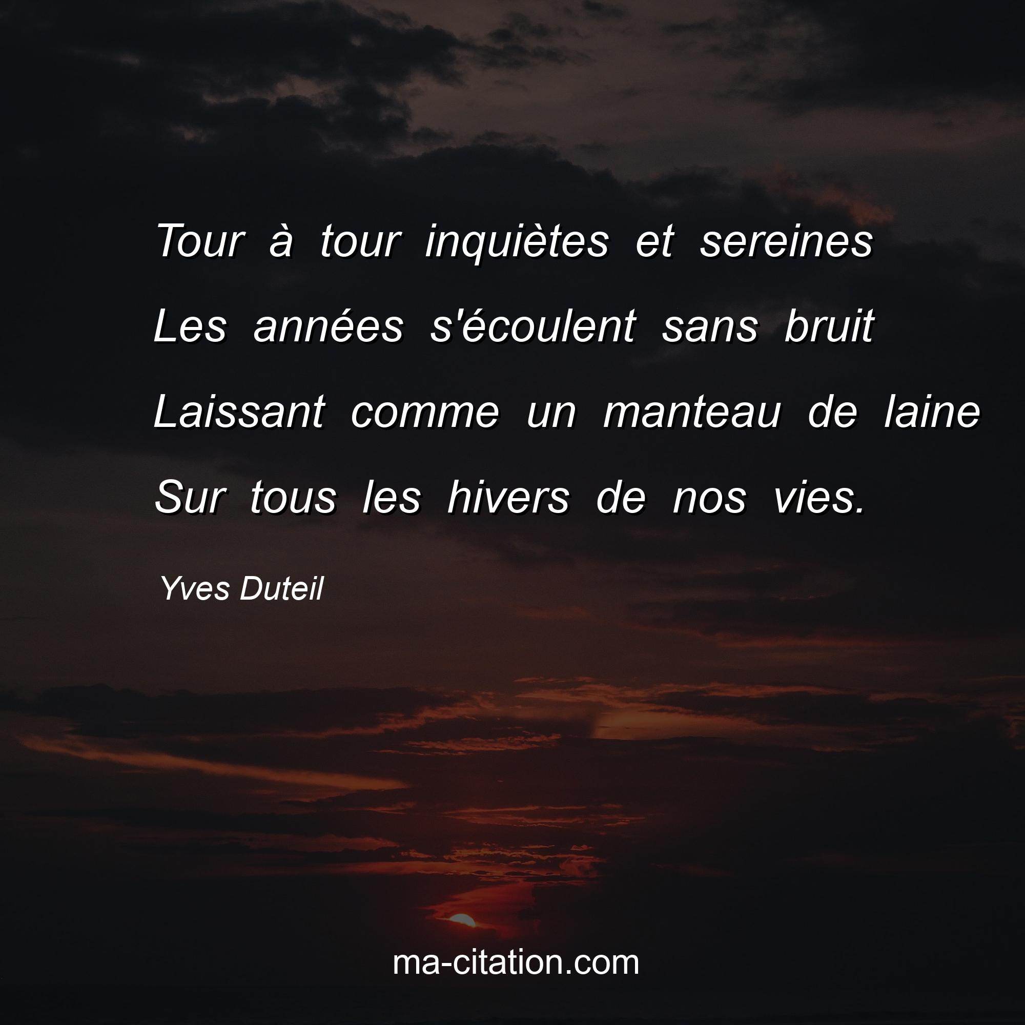 Citation sur la vie de Yves Duteil :Tour à tour inquiètes et sereines Les années s'écoulent sans bruit Laissant comme un manteau de laine Sur tous les hivers de nos vies.