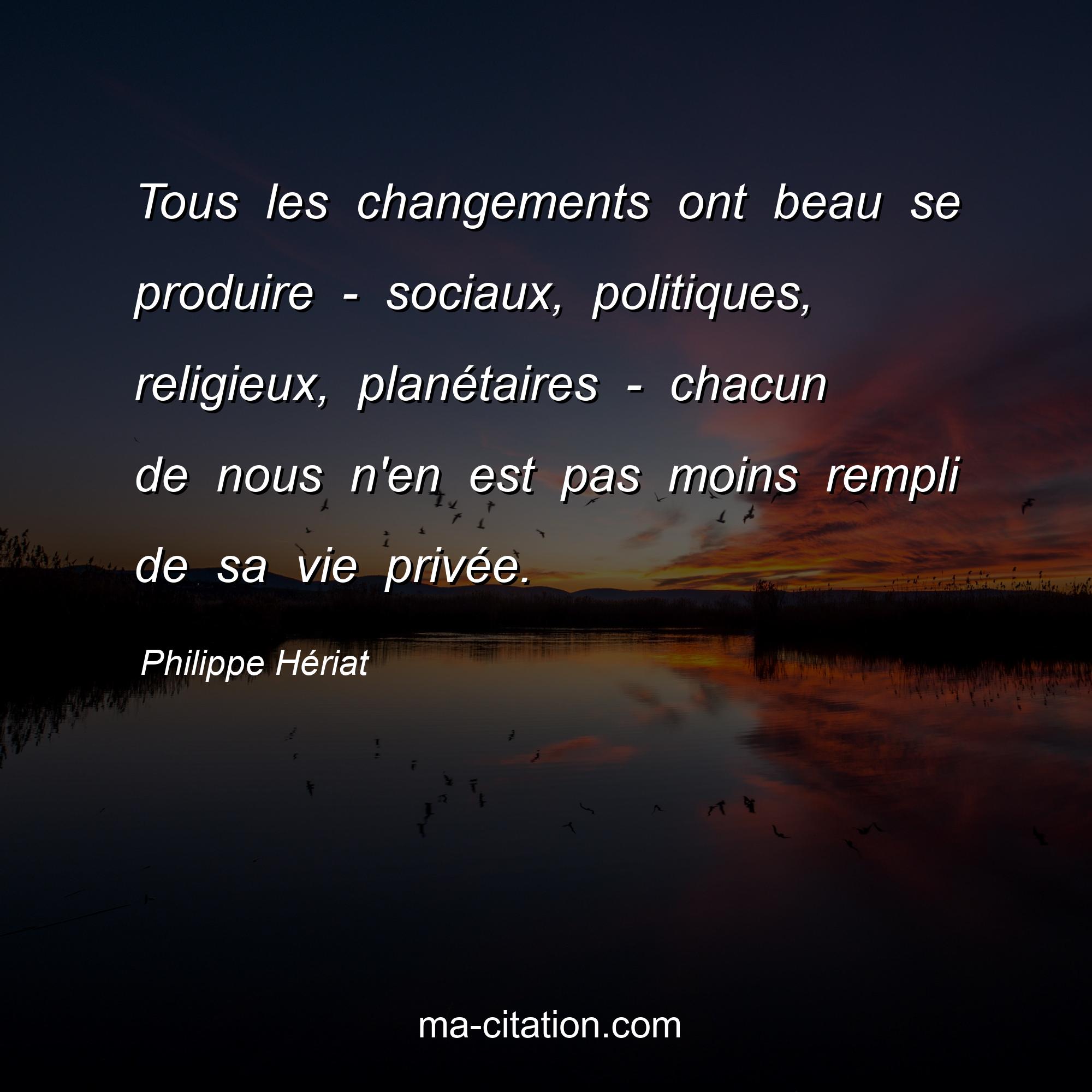 Citation sur la vie de Philippe Hériat :Tous les changements ont beau se produire - sociaux, politiques, religieux, planétaires - chacun de nous n'en est pas moins rempli de sa vie privée.