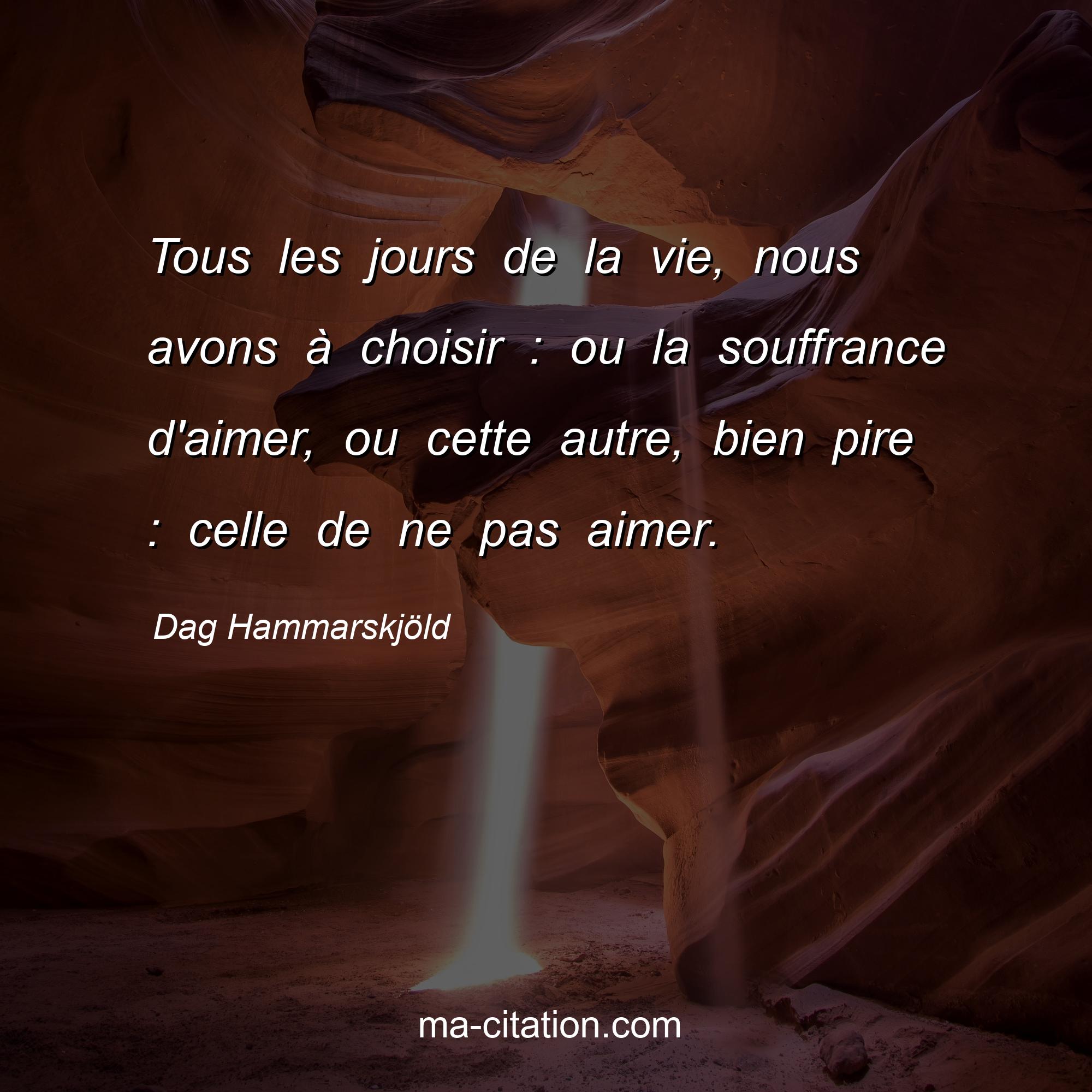 Citation sur la vie de Dag Hammarskjöld :Tous les jours de la vie, nous avons à choisir : ou la souffrance d'aimer, ou cette autre, bien pire : celle de ne pas aimer.
