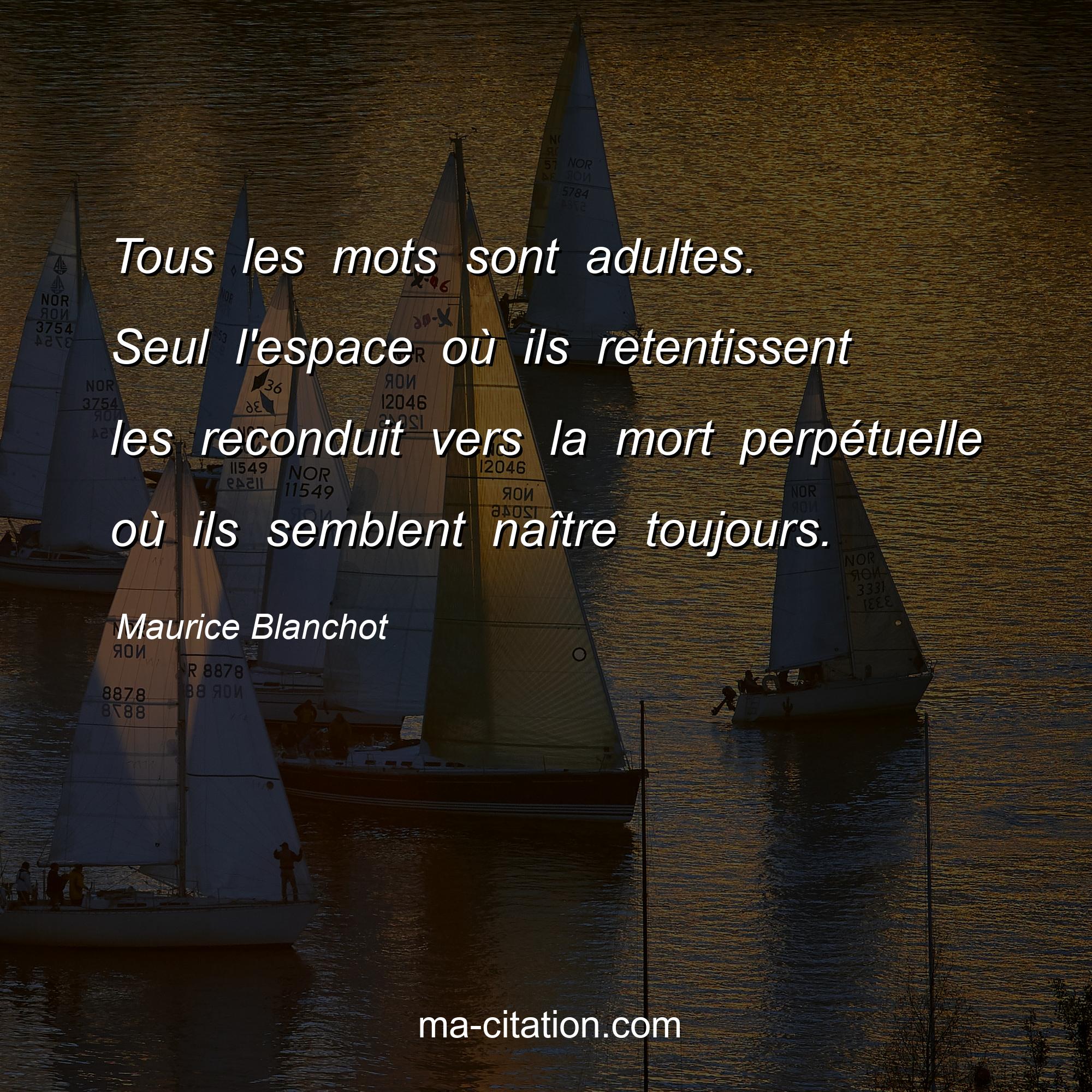 Citation sur la vie de Maurice Blanchot :Tous les mots sont adultes. Seul l'espace où ils retentissent les reconduit vers la mort perpétuelle où ils semblent naître toujours.