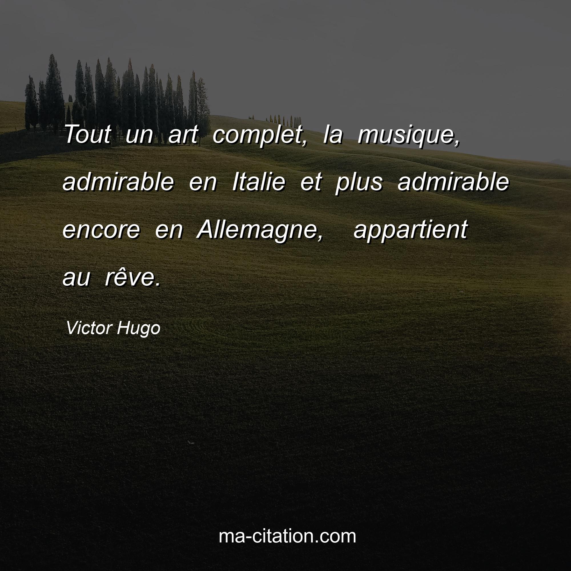 Citation sur la vie de Victor Hugo :Tout un art complet, la musique, admirable en Italie et plus admirable encore en Allemagne, appartient au rêve.