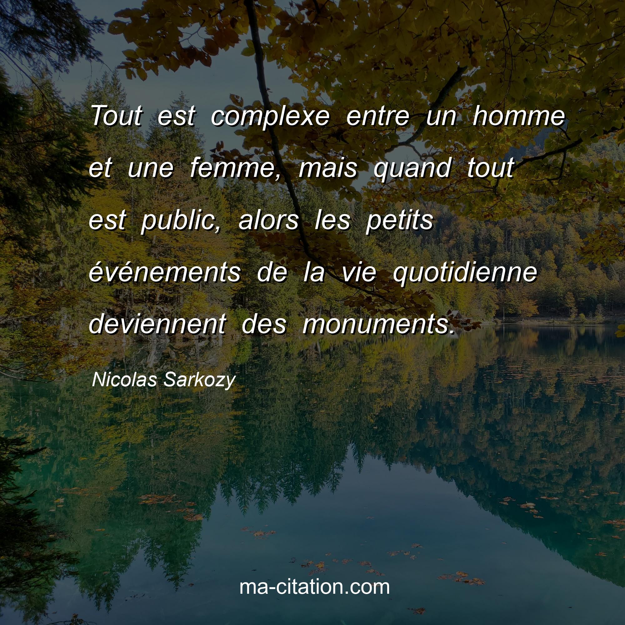 Nicolas Sarkozy est l'auteur de la citation sur la vie "Tout est complexe entre un homme et une femme, mais quand tout est public, alors les petits événements de la vie quotidienne deviennent des monuments.".