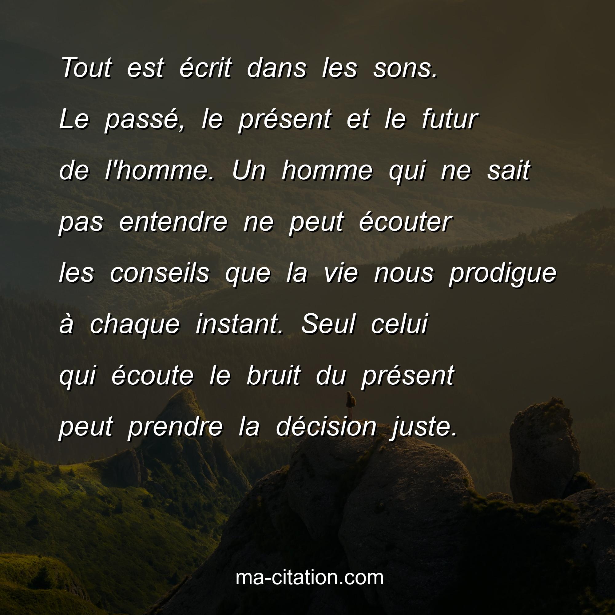 Citation sur la vie de Paulo Coelho :Tout est écrit dans les sons. Le passé, le présent et le futur de l'homme. Un homme qui ne sait pas entendre ne peut écouter les conseils que la vie nous prodigue à chaque instant. Seul celui qui écoute le bruit du présent peut prendre la décision juste.