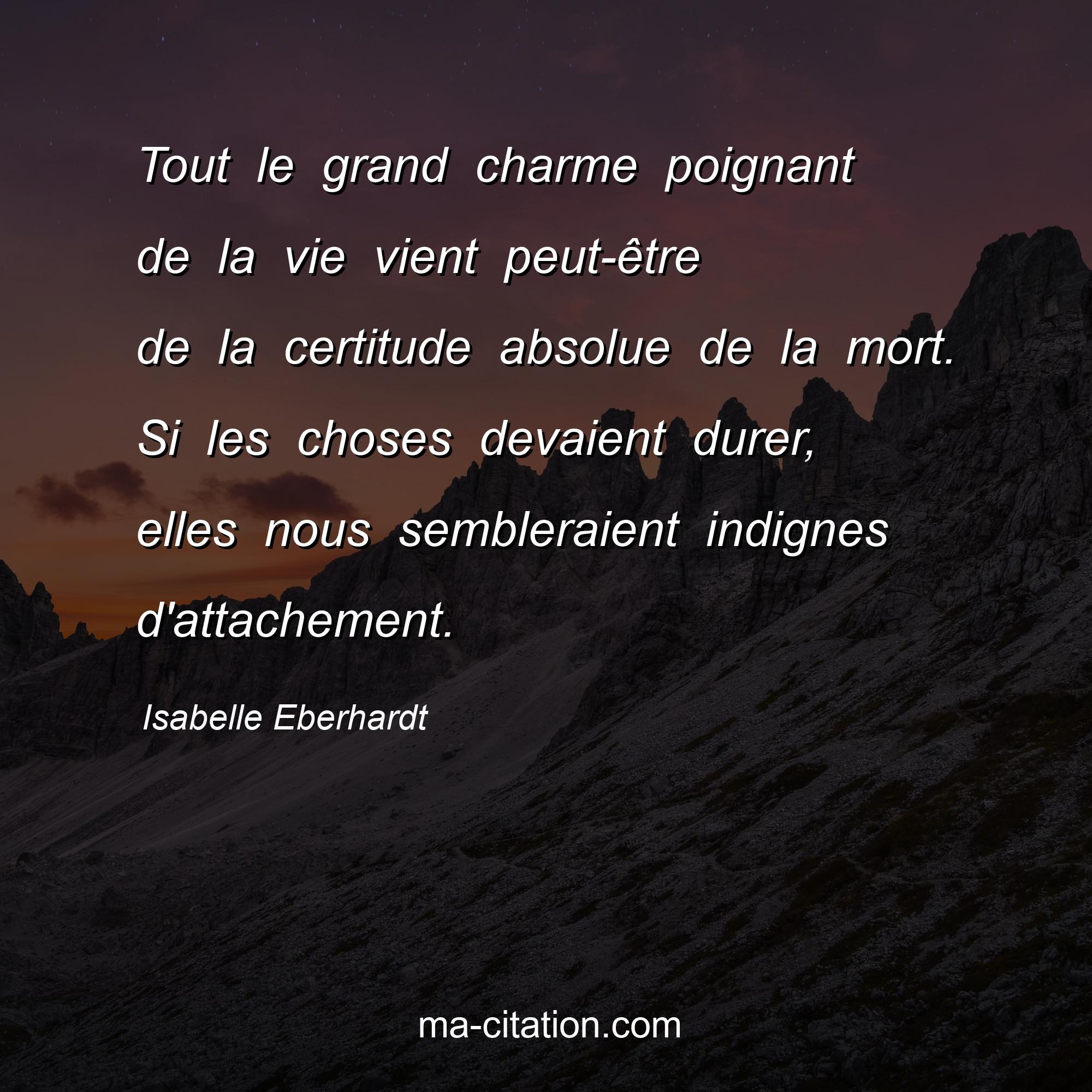 Citation sur la vie d'Isabelle Eberhardt :Tout le grand charme poignant de la vie vient peut-être de la certitude absolue de la mort. Si les choses devaient durer, elles nous sembleraient indignes d'attachement.