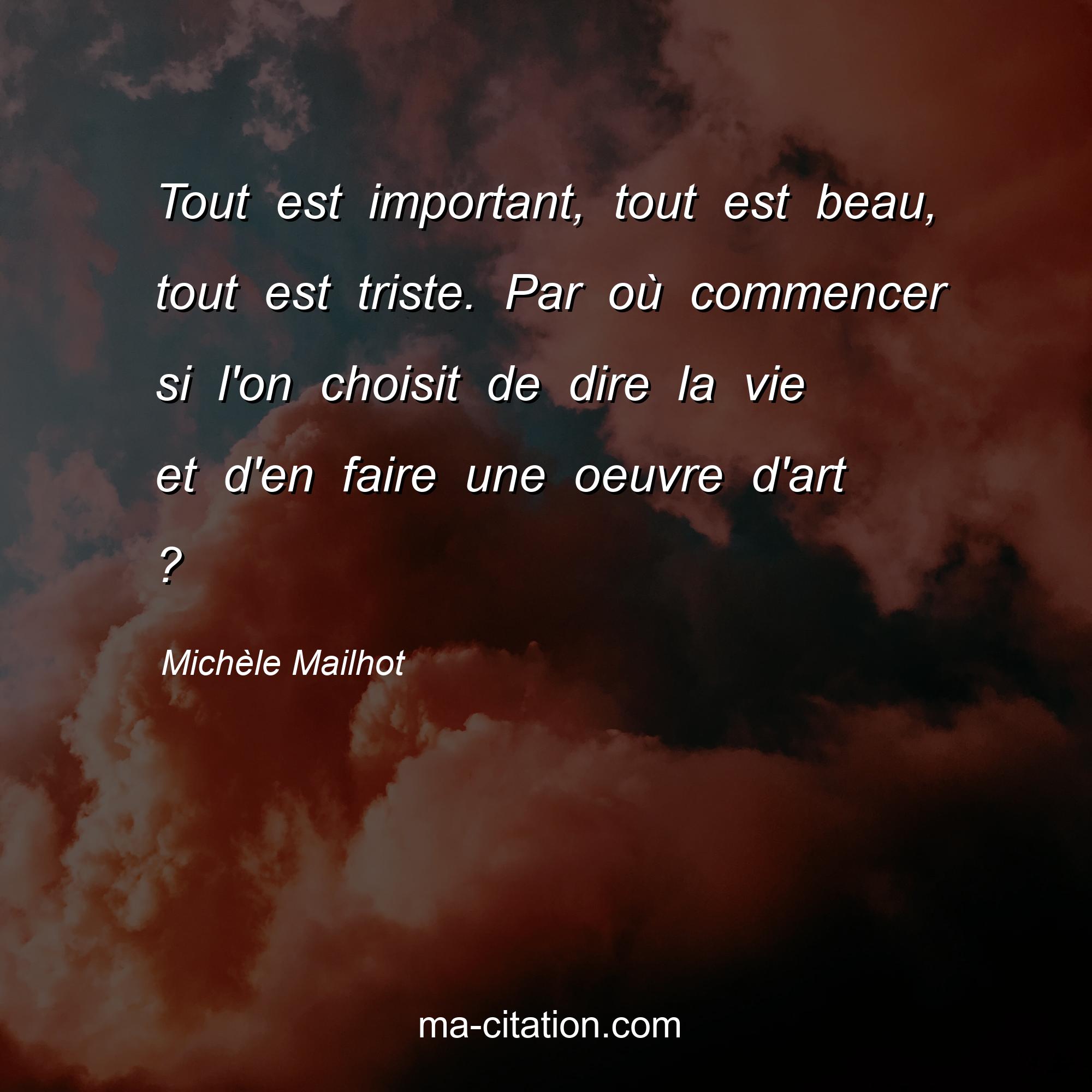 Citation sur la vie de Michèle Mailhot :Tout est important, tout est beau, tout est triste. Par où commencer si l'on choisit de dire la vie et d'en faire une oeuvre d'art ?