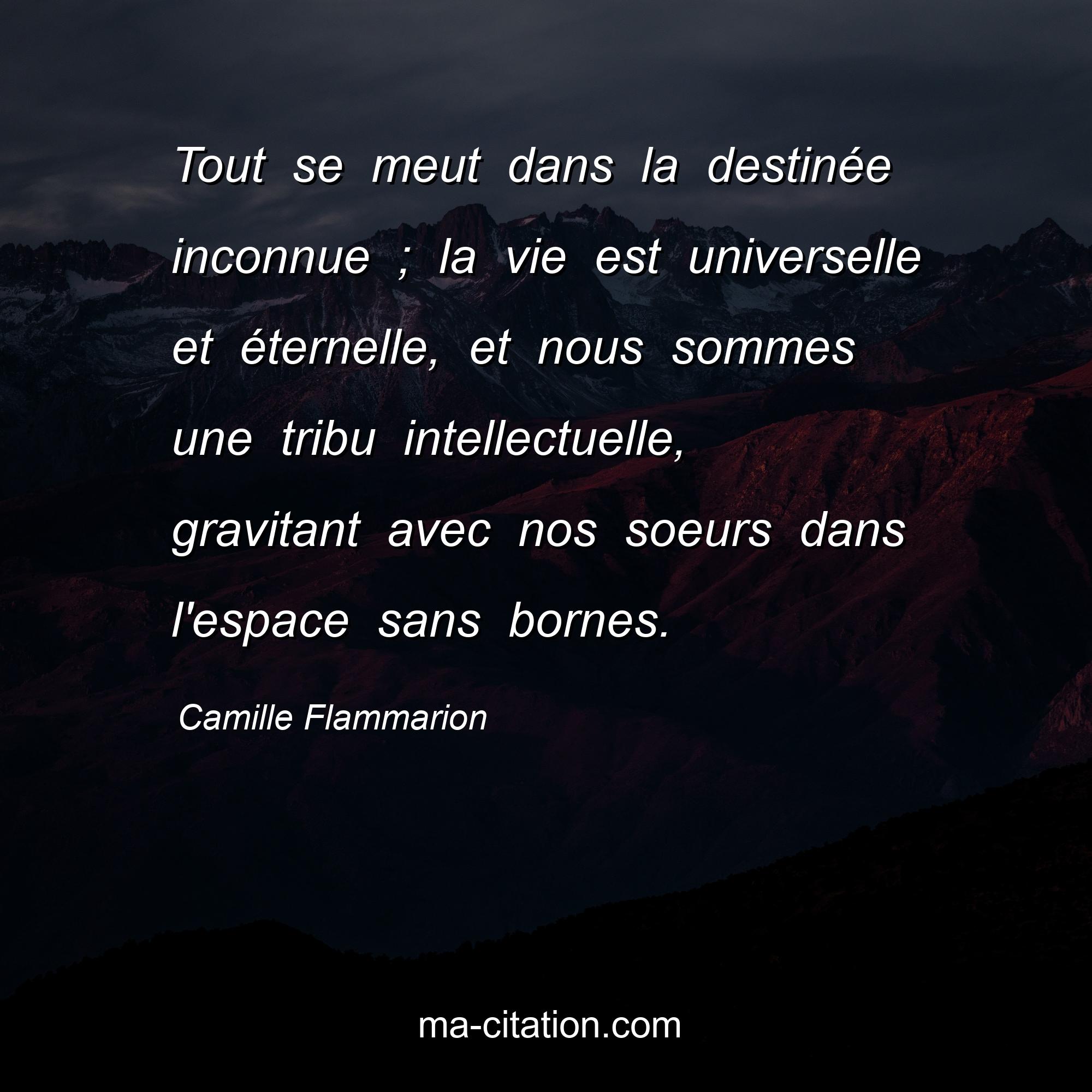 Citation sur la vie de Camille Flammarion :Tout se meut dans la destinée inconnue ; la vie est universelle et éternelle, et nous sommes une tribu intellectuelle, gravitant avec nos soeurs dans l'espace sans bornes.