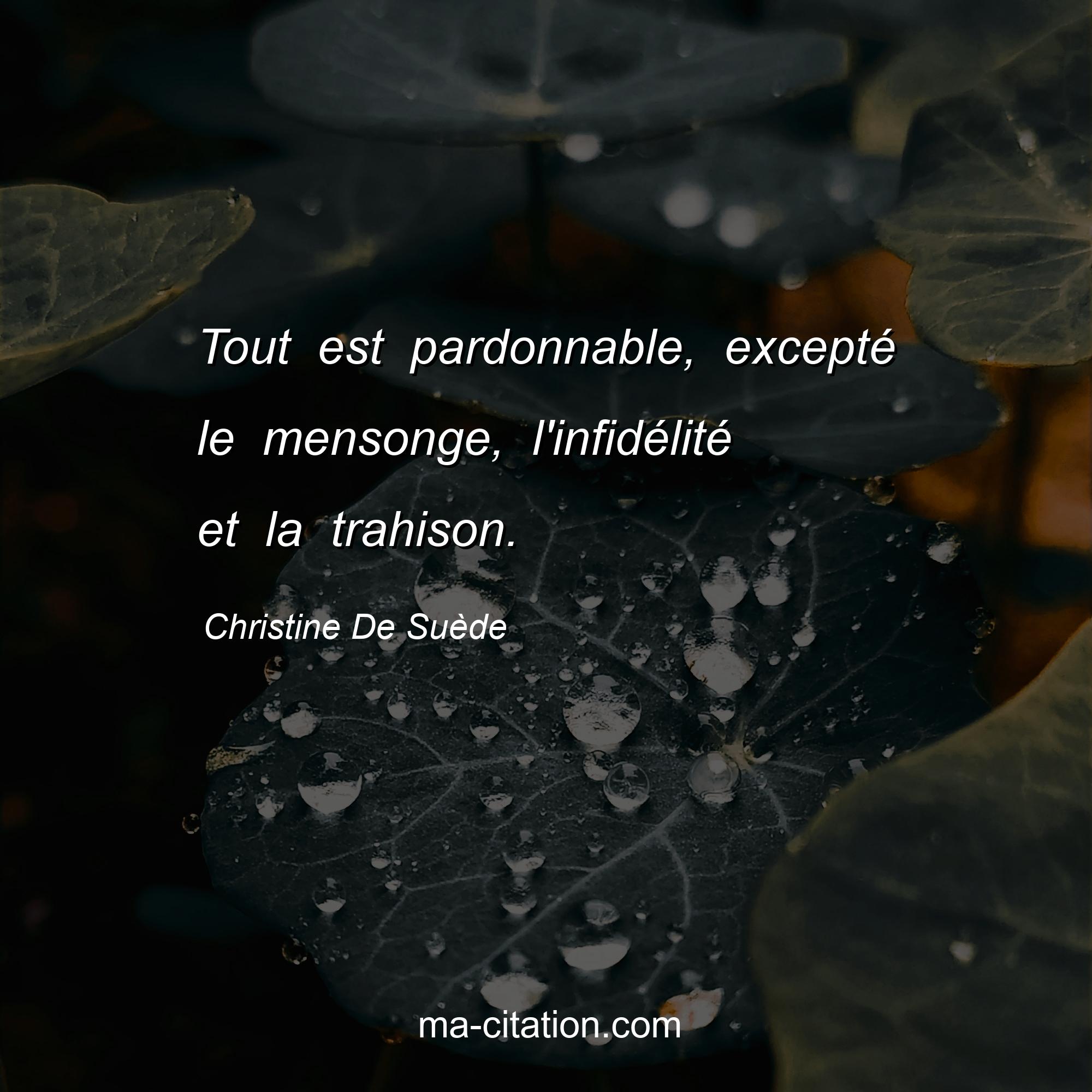 Christine De Suède est l'auteur de la citation sur la vie "Tout est pardonnable, excepté le mensonge, l'infidélité et la trahison.".