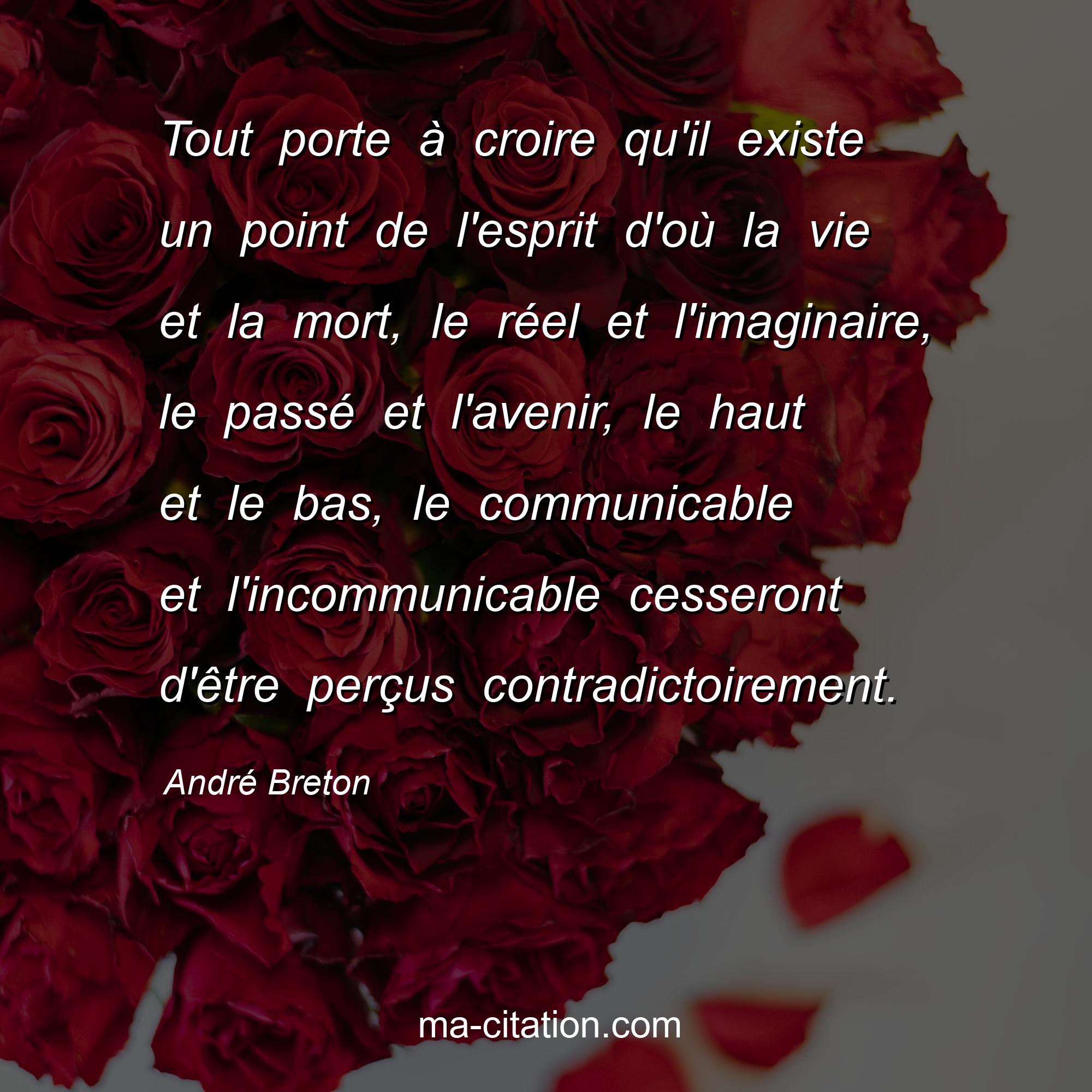 Citation sur la vie d'André Breton :Tout porte à croire qu'il existe un point de l'esprit d'où la vie et la mort, le réel et l'imaginaire, le passé et l'avenir, le haut et le bas, le communicable et l'incommunicable cesseront d'être perçus contradictoirement.