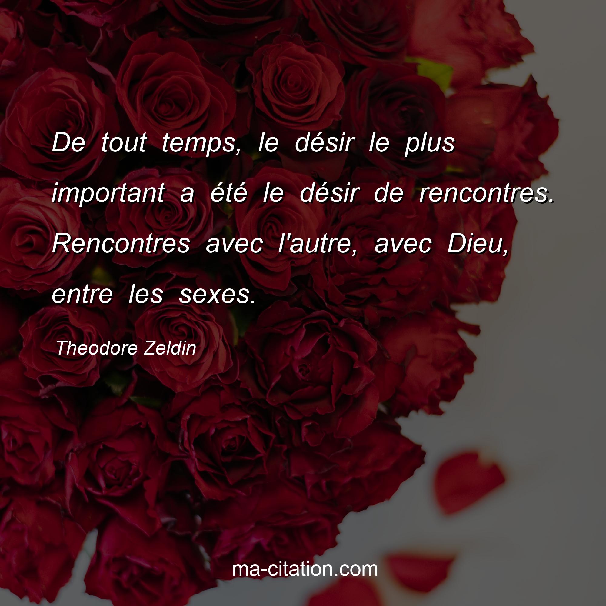 Citation sur la vie de Theodore Zeldin :De tout temps, le désir le plus important a été le désir de rencontres. Rencontres avec l'autre, avec Dieu, entre les sexes.
