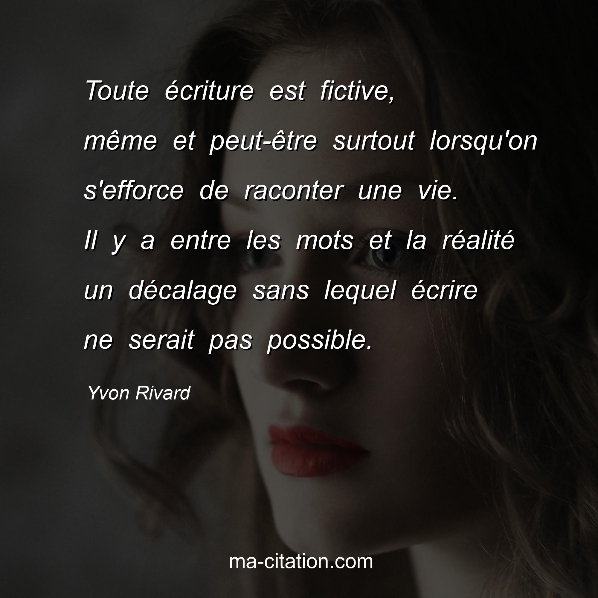 Yvon Rivard est l'auteur de la citation sur la vie "Toute écriture est fictive, même et peut-être surtout lorsqu'on s'efforce de raconter une vie. Il y a entre les mots et la réalité un décalage sans lequel écrire ne serait pas possible.".