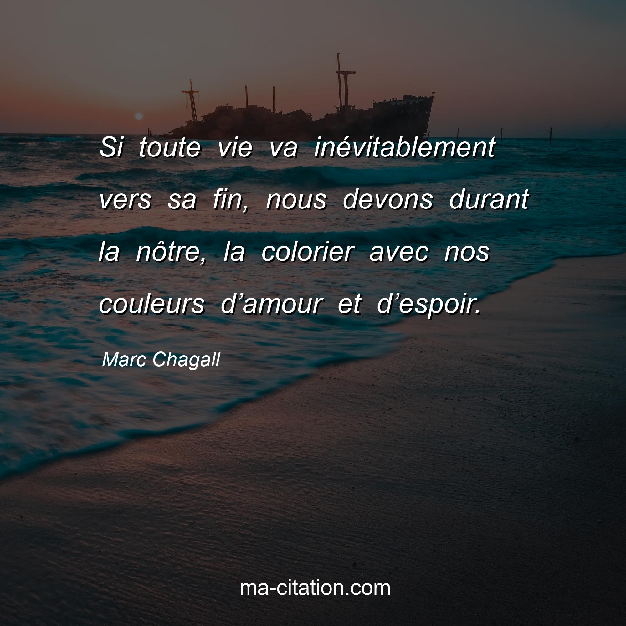 Marc Chagall est l'auteur de la citation sur la vie "Si toute vie va inévitablement vers sa fin, nous devons durant la nôtre, la colorier avec nos couleurs d’amour et d’espoir.".