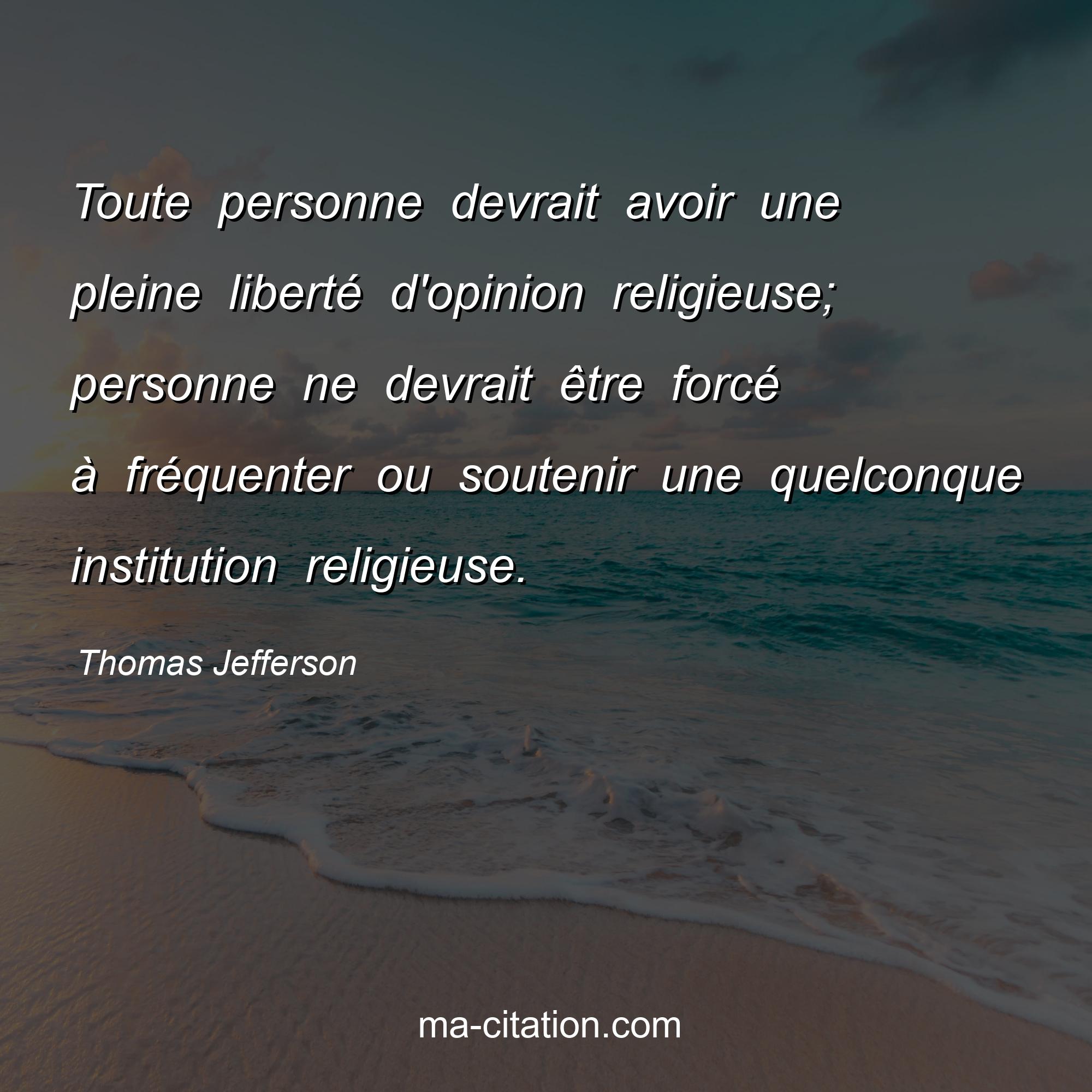 Citation sur la vie de Thomas Jefferson :Toute personne devrait avoir une pleine liberté d'opinion religieuse; personne ne devrait être forcé à fréquenter ou soutenir une quelconque institution religieuse.