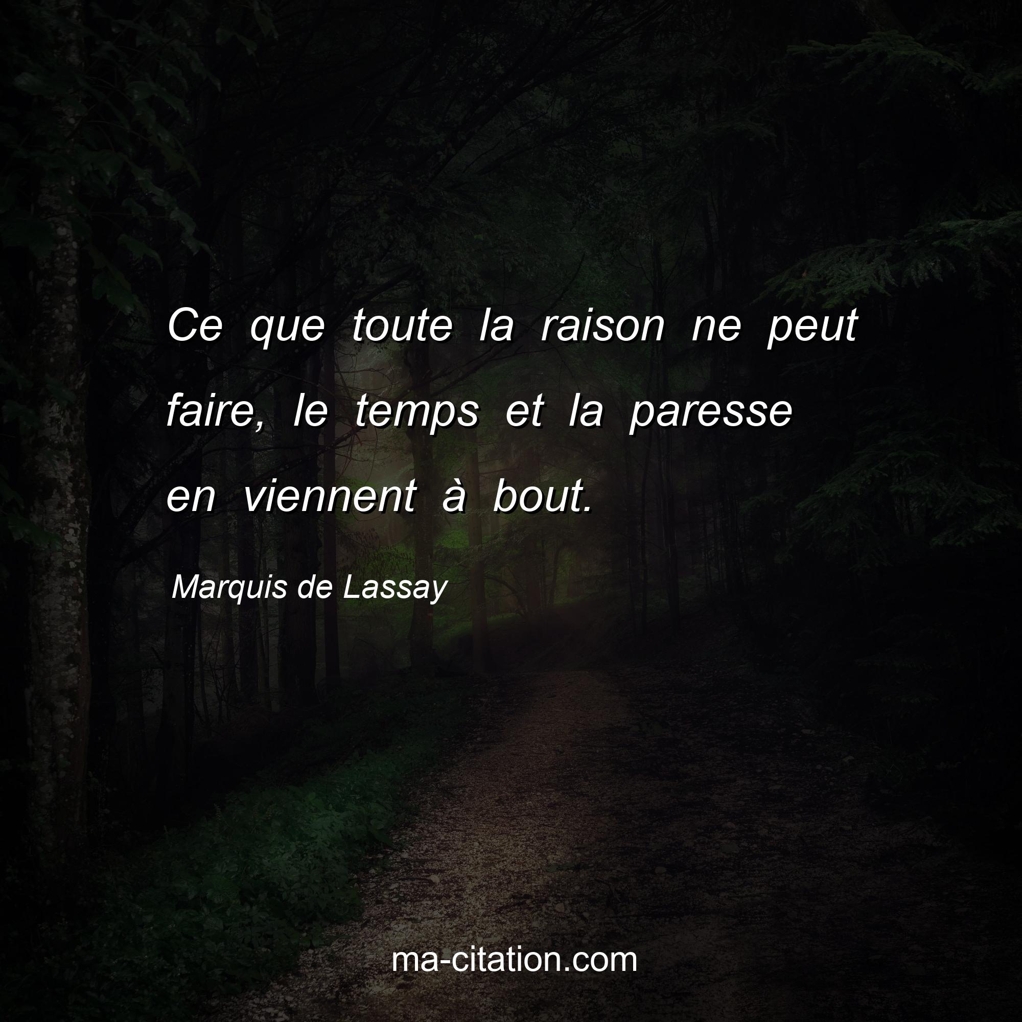 Citation sur la vie de Marquis de Lassay :Ce que toute la raison ne peut faire, le temps et la paresse en viennent à bout.